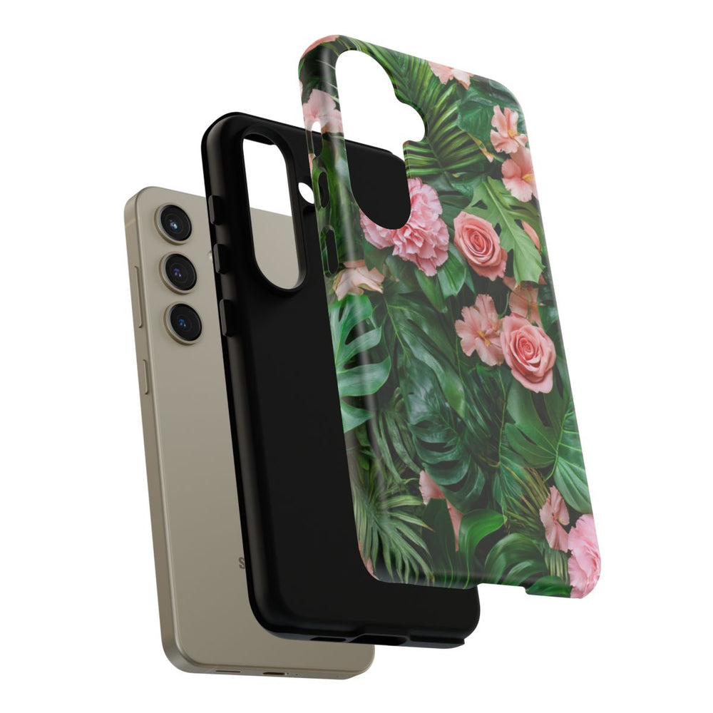 Dit hoesje heeft een weelderig patroon van roze rozen, anjers en hibiscusbloemen, verweven met verschillende tropische groene bladeren zoals monstera en palmbladeren. De combinatie van het rijke groen en de zachte roze bloemen zorgt voor een levendig en natuurlijk ontwerp. Het matte, stevige hoesje is voorzien van een polycarbonaat buitenkant en een TPU-binnenzijde voor extra stevigheid en biedt ondersteuning voor draadloos opladen.