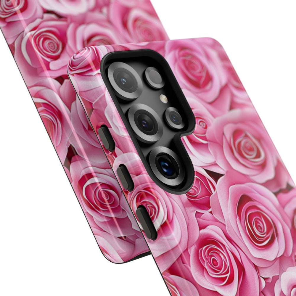 Dit telefoonhoesje heeft een opvallend ontwerp met een close-up van talloze roze rozen die dicht op elkaar zijn afgebeeld. De rozen verschillen subtiel in grootte en tint, met sierlijke bloemblaadjes en zachte roze kleurverlopen. De afbeelding is gedrukt op een glanzend, stevig hoesje met een buitenlaag van polycarbonaat en een binnenlaag van TPU voor dubbele bescherming. Het hoesje ondersteunt draadloos opladen en is bestand tegen weersinvloeden, waardoor de afbeelding langdurig mooi blijft.