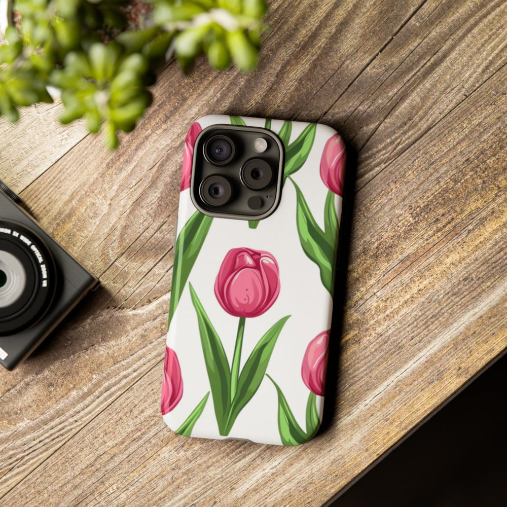 Dit hoesje heeft een naadloos patroon van roze tulpen met groene bladeren op een witte achtergrond. De tulpen zijn gedetailleerd getekend met schaduwen en lichte accenten, wat zorgt voor een levendige en frisse uitstraling. Het patroon herhaalt zich gelijkmatig en geeft het hoesje een harmonieuze en aantrekkelijke look. Het glanzende, stevige hoesje is gemaakt van een polycarbonaat buitenkant en een TPU-binnenzijde, wat zorgt voor dubbele bescherming en ondersteuning voor draadloos opladen. De heldere kleuren en het bloemmotief maken dit hoesje ideaal voor het voorjaar of voor liefhebbers van de natuur.