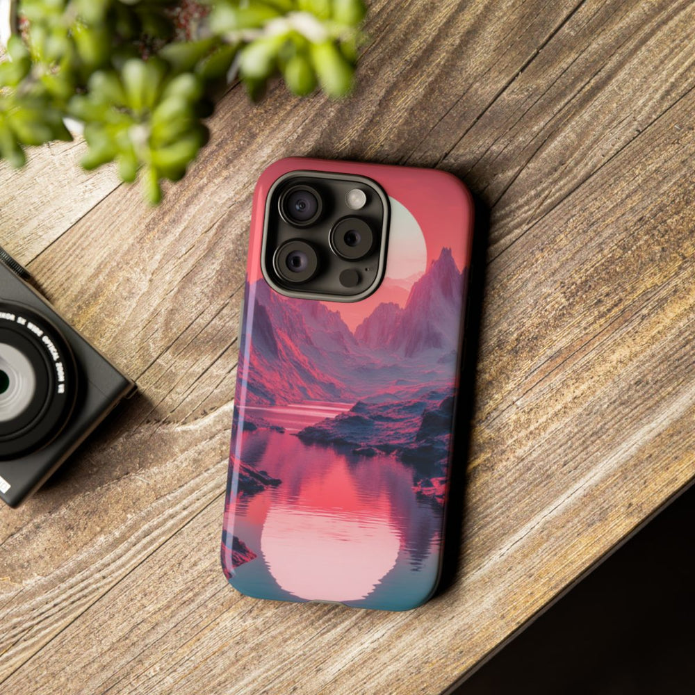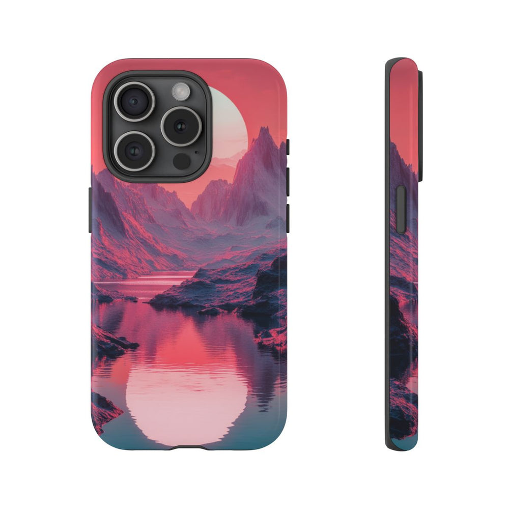 Dit hoesje toont een indrukwekkend landschap met grillige bergen rond een rustige rivier. De omgeving is gehuld in levendig roze licht, wat zorgt voor een surrealistische en futuristische sfeer. Een grote, bleke zon of maan staat laag aan de hemel en werpt haar weerspiegeling op het water. Het ruige landschap steekt mooi af tegen het gladde wateroppervlak en benadrukt de natuurlijke schoonheid van het tafereel. Het hoesje is glanzend en stevig, gemaakt van duurzaam polycarbonaat met een TPU-binnenzijde en geschikt voor draadloos opladen.