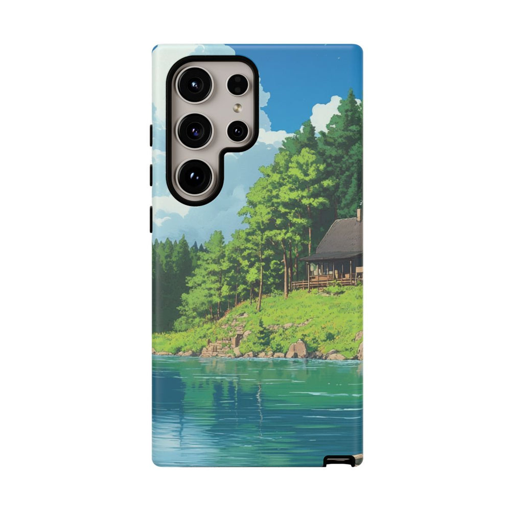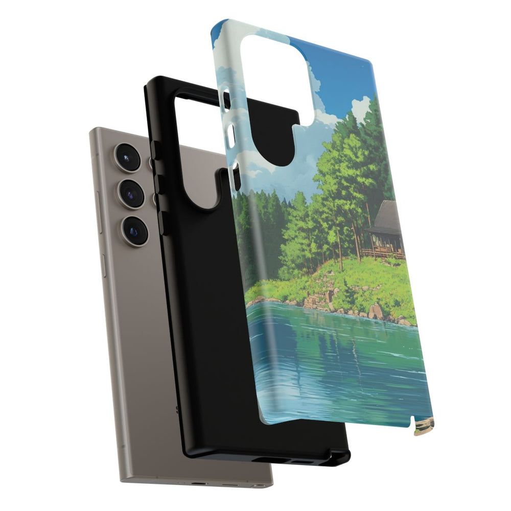 Dit hoesje toont een rustgevend meer, omringd door levendige groene bomen en een knusse hut verscholen tussen het groen. Het water weerspiegelt de heldere blauwe lucht en witte wolken, wat zorgt voor een kalme en vredige sfeer. Het ontwerp brengt de schoonheid van de natuur tot leven en is ideaal voor liefhebbers van rustige buitenlandschappen. De stevige buitenkant van polycarbonaat en de TPU-binnenzijde bieden optimale bescherming voor je toestel, terwijl het prachtige tafereel goed zichtbaar blijft.