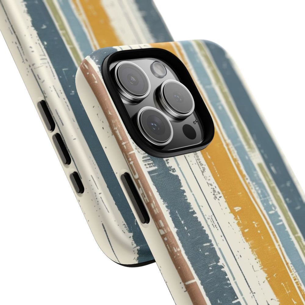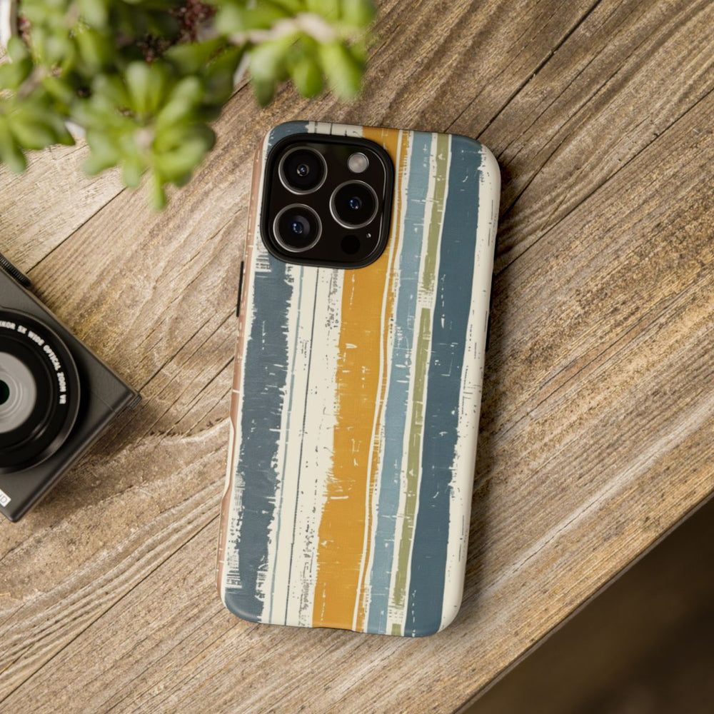 Dit hoesje is voorzien van verticale strepen met een rustieke, geweven uitstraling die doet denken aan linnenstof. De strepen verschillen in breedte en tonen, met kleuren als mosterdgeel, gedempt blauw, olijfgroen, beige en bruin. Het patroon loopt naadloos door en zorgt voor een natuurlijke, ambachtelijke uitstraling. Het hoesje bestaat uit twee lagen van polycarbonaat en TPU, waardoor het stevig is en optimale bescherming biedt. Daarnaast ondersteunt het draadloos opladen. De algehele uitstraling is casual en aards.