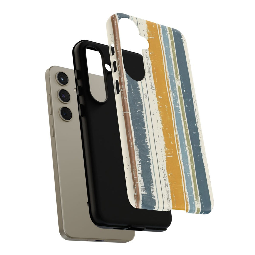 Dit hoesje is voorzien van verticale strepen met een rustieke, geweven uitstraling die doet denken aan linnenstof. De strepen verschillen in breedte en tonen, met kleuren als mosterdgeel, gedempt blauw, olijfgroen, beige en bruin. Het patroon loopt naadloos door en zorgt voor een natuurlijke, ambachtelijke uitstraling. Het hoesje bestaat uit twee lagen van polycarbonaat en TPU, waardoor het stevig is en optimale bescherming biedt. Daarnaast ondersteunt het draadloos opladen. De algehele uitstraling is casual en aards.