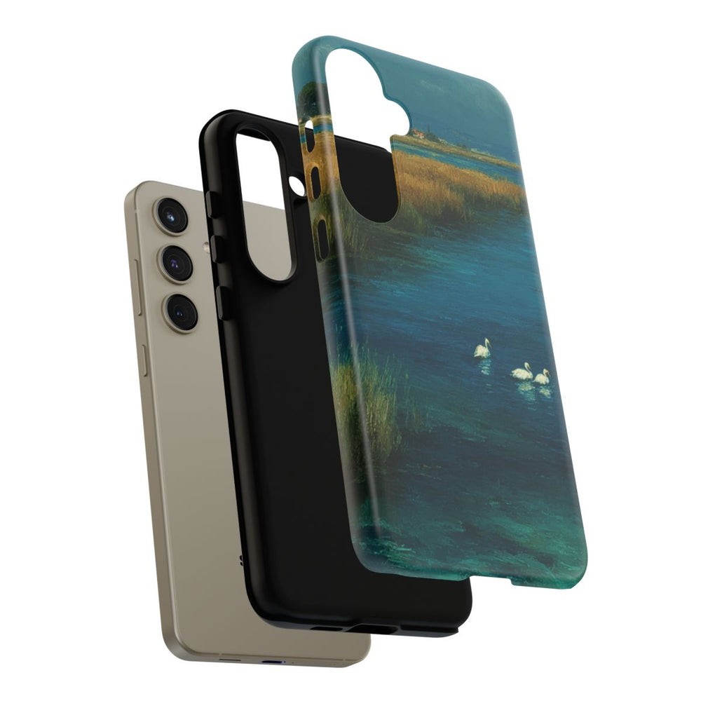 Dit hoesje toont een vredig moeraslandschap met een smalle blauwe waterstroom tussen hoge goudkleurige grassen. Drie witte zwanen drijven rustig op het water. Op de achtergrond zijn gebouwen en bomen te zien onder een deels bewolkte lucht. Het ontwerp is gedrukt op een stevige matte telefoonhoes met dubbele laag van polycarbonaat en TPU. Geschikt voor draadloos opladen en bestand tegen weersinvloeden.