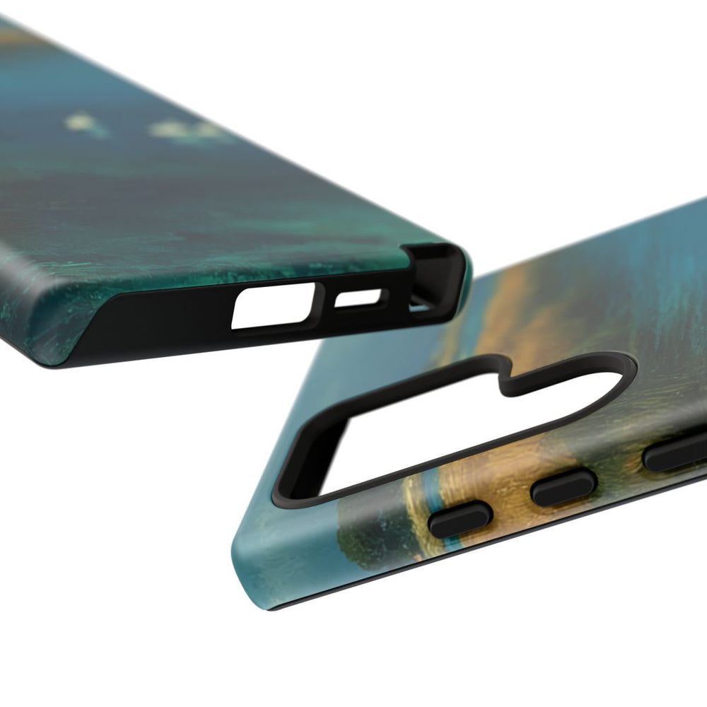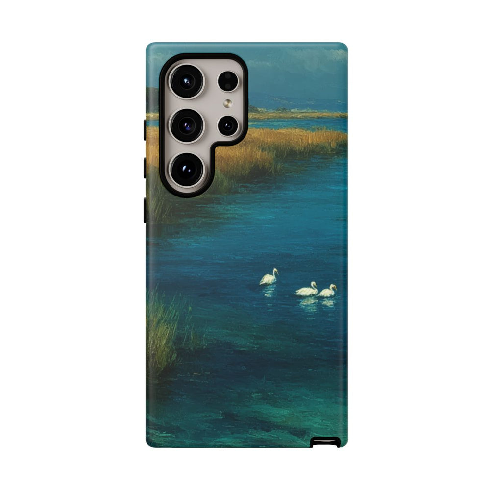 Dit telefoonhoesje toont een vredig moeraslandschap met een smalle blauwe waterstroom die door hoge goudkleurige grasvelden loopt. Drie witte zwanen zwemmen rustig in het water. Op de achtergrond zijn bomen en enkele kleine gebouwen te zien onder een deels bewolkte hemel. De afbeelding is aangebracht op een mat hoesje met een stevige polycarbonaat buitenkant en een TPU binnenzijde, wat zorgt voor extra bescherming en ondersteuning van draadloos opladen.