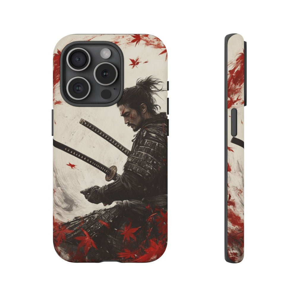 Dit telefoonhoesje toont een gedetailleerde illustratie van een samurai in traditionele harnas, gewapend met twee katana's. Rondom de samurai dwarrelen rode esdoornbladeren en penseelstreken die samen een dynamisch, cirkelvormig kader vormen. De lichte achtergrond zorgt voor een mooi contrast met het donkere harnas en de felrode bladeren. De afbeelding is gedrukt op een mat hoesje met een stevige polycarbonaat buitenkant en TPU-binnenzijde. Het hoesje is ontworpen voor extra bescherming en ondersteunt draadloos opladen.