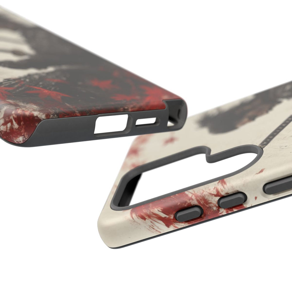 Dit hoesje toont een gedetailleerde afbeelding van een samurai in traditionele harnas, die twee katana’s vasthoudt. Rondom de samurai dwarrelen rode esdoornbladeren in een dynamische cirkel, versterkt door penseelstrekeffecten. De achtergrond heeft een licht getextureerde, gebroken witte kleur, waardoor het donkere harnas en de felrode bladeren extra opvallen. Het hoesje bestaat uit twee lagen met een stevige polycarbonaat buitenkant en een TPU binnenzijde, is geschikt voor draadloos opladen en biedt bescherming tegen verschillende weersomstandigheden.