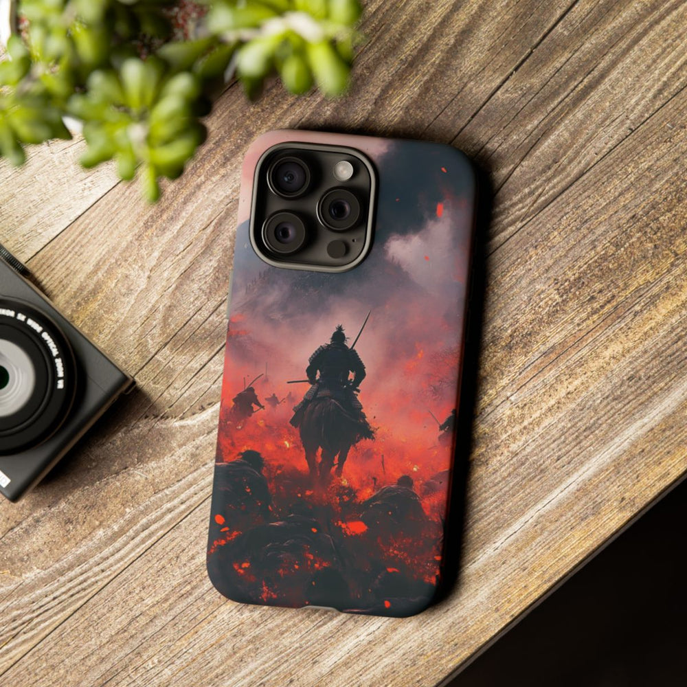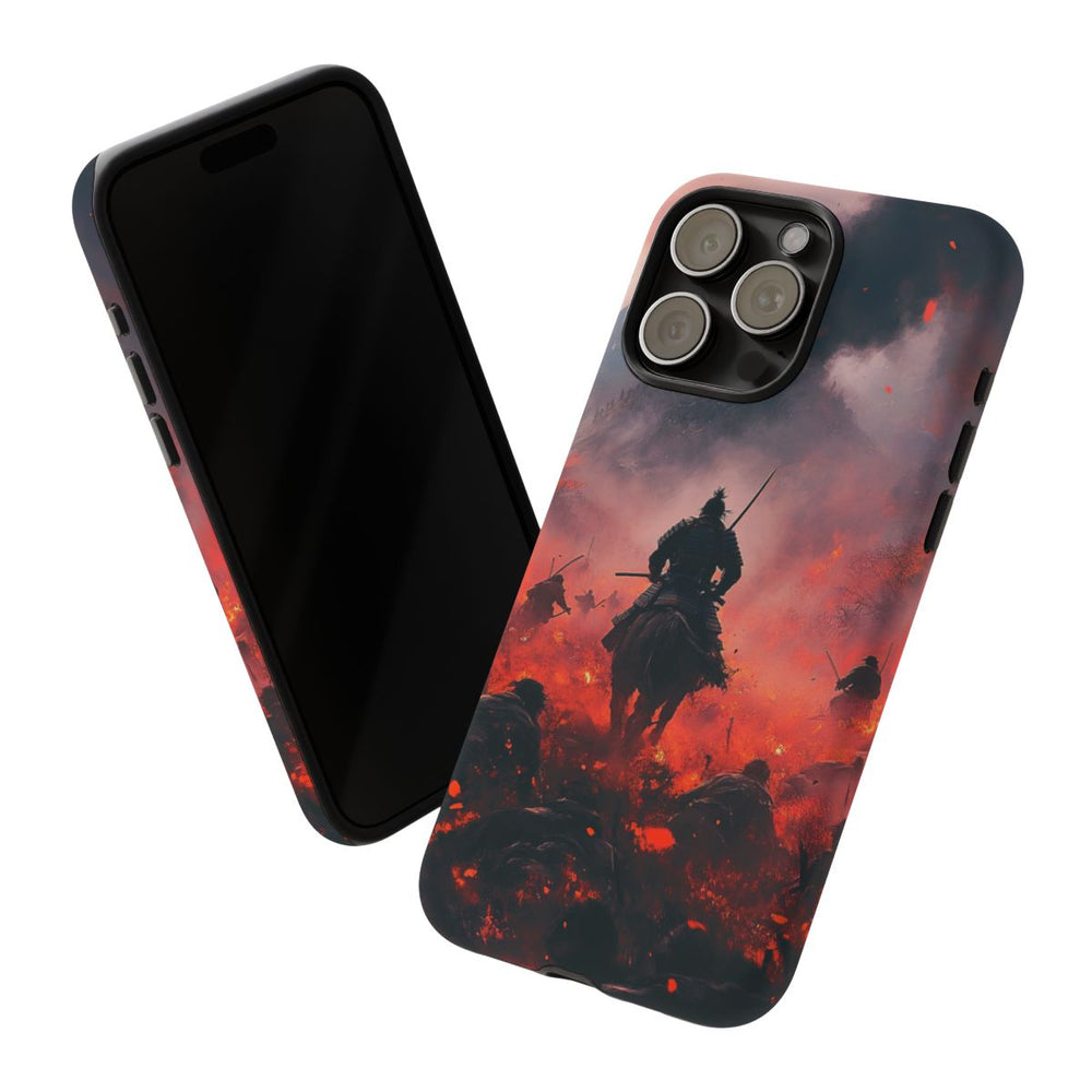 Dit ontwerp toont een dramatische veldslag met samurai die zegevierend wegrijden. Op de achtergrond zie je een rokerige lucht en een kasteel in de verte, terwijl op de voorgrond gevallen soldaten liggen tussen vurige kleuren. De afbeelding straalt actie en intensiteit uit en maakt het hoesje tot een echte blikvanger. Het hoesje bestaat uit 100% polycarbonaat en 100% TPU voor een dubbele beschermlaag en extra stevigheid. Ondersteunt draadloos opladen, met uitzondering van MagSafe.