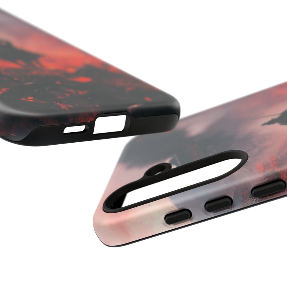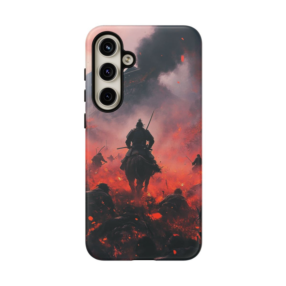 Dit ontwerp toont een indrukwekkend slagveld met samurai die weg galopperen van een vurige omgeving. Op de achtergrond zie je een kasteel tussen de rook en bergen, terwijl op de voorgrond gevallen strijders liggen. De kleuren zijn levendig, met diepe roodtinten en donkere accenten die zorgen voor een intense sfeer. Dit telefoonhoesje heeft een stevige dubbele laag voor extra bescherming en ondersteunt draadloos opladen. Zo combineer je stijl en functionaliteit voor jouw toestel.