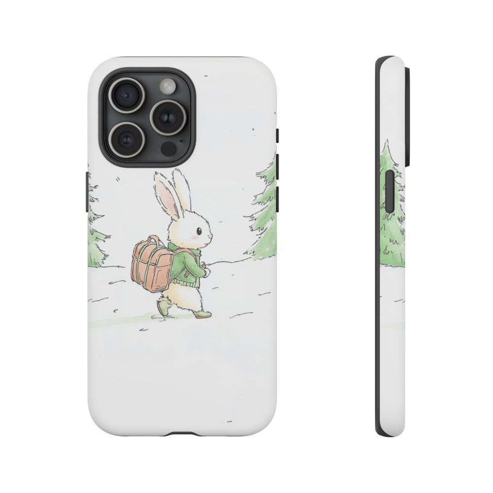 Dit ontwerp toont een klein wit konijntje dat door een besneeuwd landschap loopt. Het konijntje draagt een groene jas en heeft een bruine rugzak op zijn rug. Rondom het konijntje staan verschillende groene dennenbomen en een kale boom, tegen een overwegend witte achtergrond. De afbeelding heeft een zachte, handgetekende aquarelstijl. Het hoesje is voorzien van een polycarbonaat buitenkant en een TPU binnenzijde, ondersteunt draadloos opladen en biedt extra stevigheid.
