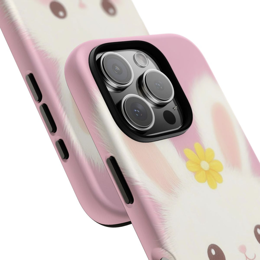 Dit ontwerp toont een pluizig wit konijntje met grote donkere ogen en roze wangetjes, dat nieuwsgierig over een lichte ondergrond kijkt. Het konijntje draagt een gele bloem op zijn hoofd en heeft zachtroze oortjes aan de binnenkant. De achtergrond is effen lichtroze. Dit matte, stevige telefoonhoesje is voorzien van een polycarbonaat buitenkant en een TPU-binnenzijde, waardoor het optimale bescherming biedt. Ondersteunt draadloos opladen.