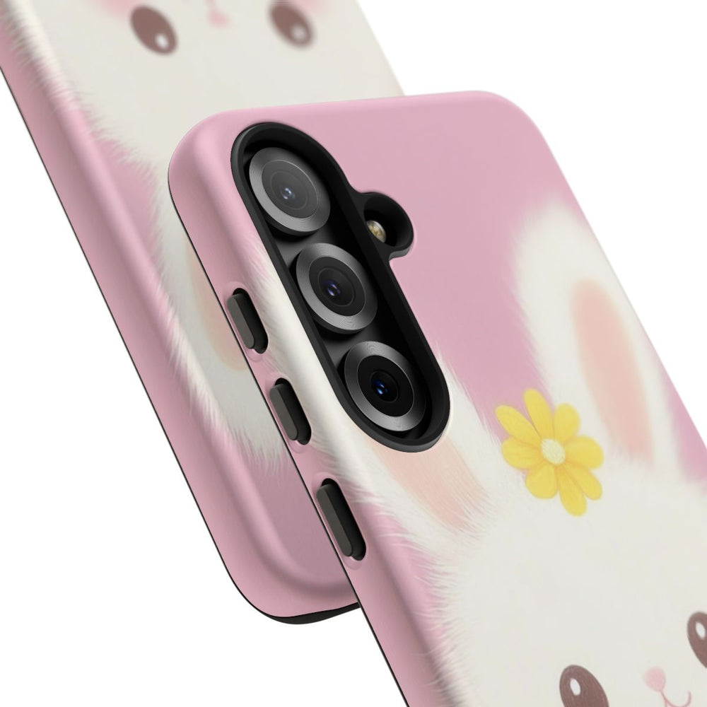 Dit ontwerp toont een pluizig wit konijntje met grote, ronde zwarte ogen en roze blosjes op de wangen. Het konijntje heeft lange oren met zachtroze binnenkant en draagt een kleine gele bloem op het hoofd. Het lijkt over een witte rand te gluren tegen een effen roze achtergrond. Het hoesje bestaat uit twee lagen van polycarbonaat en TPU voor extra stevigheid en ondersteunt draadloos opladen.