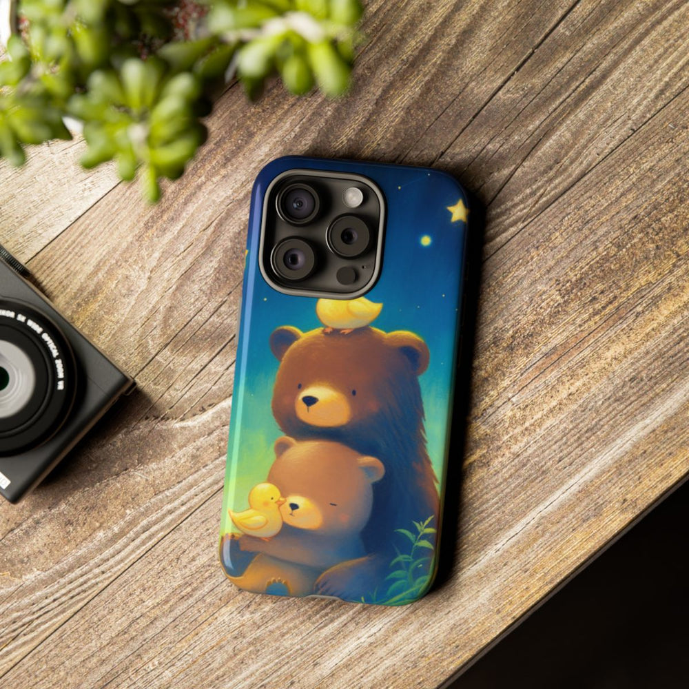 Dit telefoonhoesje toont twee beren die dicht naast elkaar zitten in het gras, onder een diepblauwe nachtelijke hemel vol fonkelende sterren. Op het hoofd van de grote beer rust een klein geel eendje, terwijl de kleine beer liefdevol een ander eendje vasthoudt. De illustratie heeft een zachte, geschilderde uitstraling met warme verlichting die de dieren en het gras mooi uitlicht. Op de achtergrond is een sterrenhemel te zien, met vaag zichtbare sterrenbeelden. Het hoesje is glanzend, stevig en gemaakt van duurzame materialen. Geschikt voor draadloos opladen.