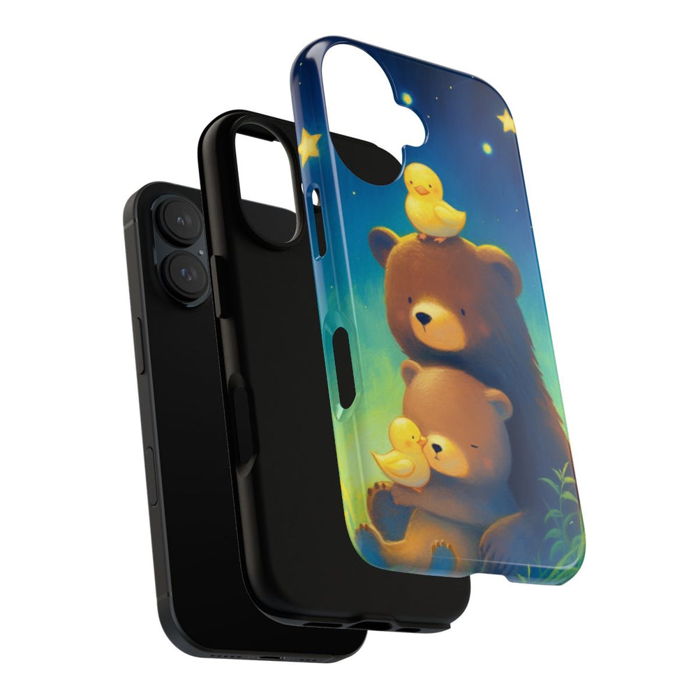 Dit telefoonhoesje toont twee beren die dicht naast elkaar zitten in het gras, onder een diepblauwe nachtelijke hemel vol fonkelende sterren. Op het hoofd van de grote beer rust een klein geel eendje, terwijl de kleine beer liefdevol een ander eendje vasthoudt. De illustratie heeft een zachte, geschilderde uitstraling met warme verlichting die de dieren en het gras mooi uitlicht. Op de achtergrond is een sterrenhemel te zien, met vaag zichtbare sterrenbeelden. Het hoesje is glanzend, stevig en gemaakt van duurzame materialen. Geschikt voor draadloos opladen.