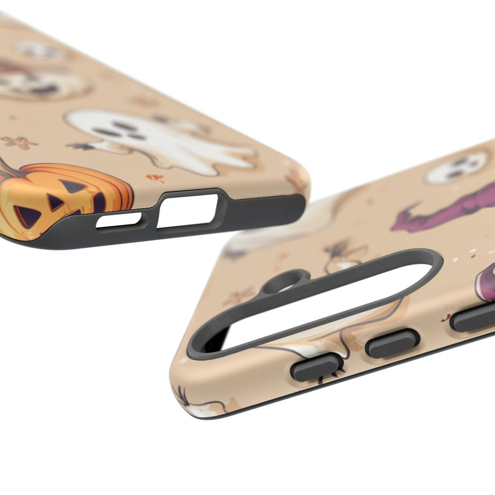 Dit telefoonhoesje heeft een naadloos patroon met vrolijke tekenfilmgeestjes, pompoenen en kleine schedeltjes op een beige achtergrond. Sommige pompoenen dragen paarse heksenhoeden en er zijn zwarte spinnetjes verspreid over het ontwerp. De geestjes hebben expressieve gezichten met grote zwarte ogen en open mondjes. De stijl is speels en levendig, met oog voor digitale details. Het hoesje bestaat uit twee stevige lagen van polycarbonaat en TPU, waardoor het duurzaam is en goed bestand tegen gebruik buitenshuis. Geschikt voor draadloos opladen.