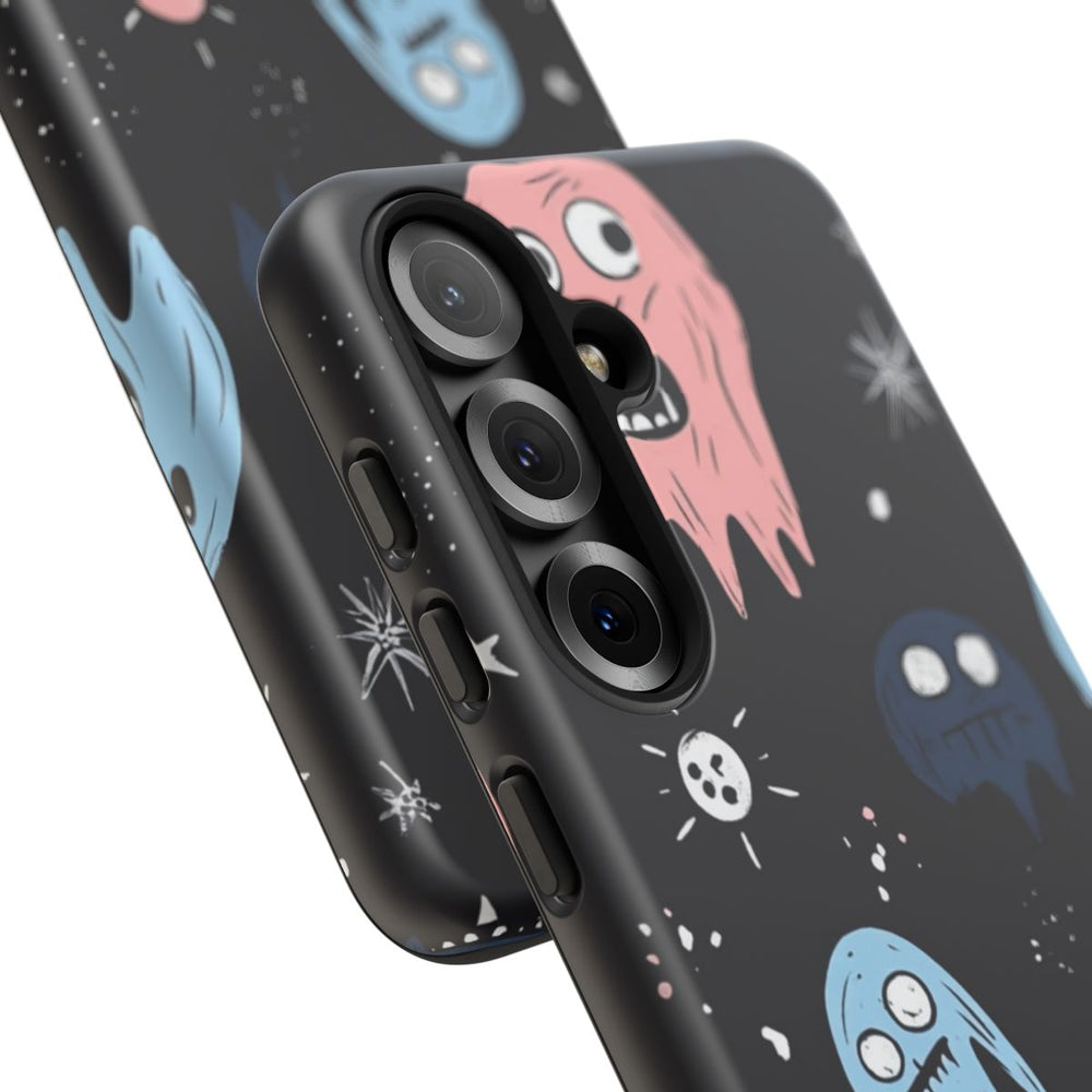 Dit hoesje is bedrukt met een naadloos patroon van schattige spookjes in pastelroze, lichtblauw en donkerblauw. De spookjes hebben verschillende expressieve gezichten met grote ogen en open monden, wat zorgt voor een speelse en toch griezelige uitstraling. De zwarte achtergrond is versierd met kleine witte sterretjes en stipjes, wat het nachtelijke en mysterieuze thema versterkt. Het matte, stevige hoesje heeft een dubbele laag voor extra bescherming en duurzaamheid.
