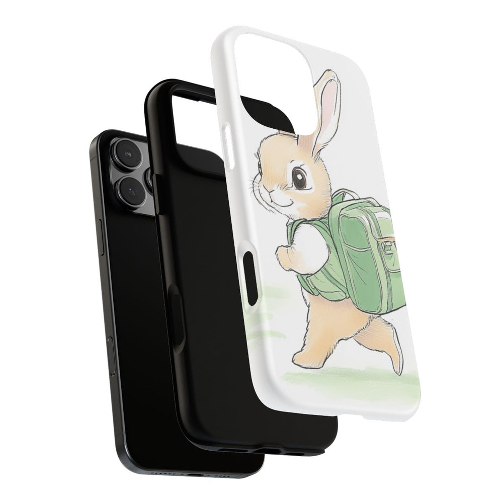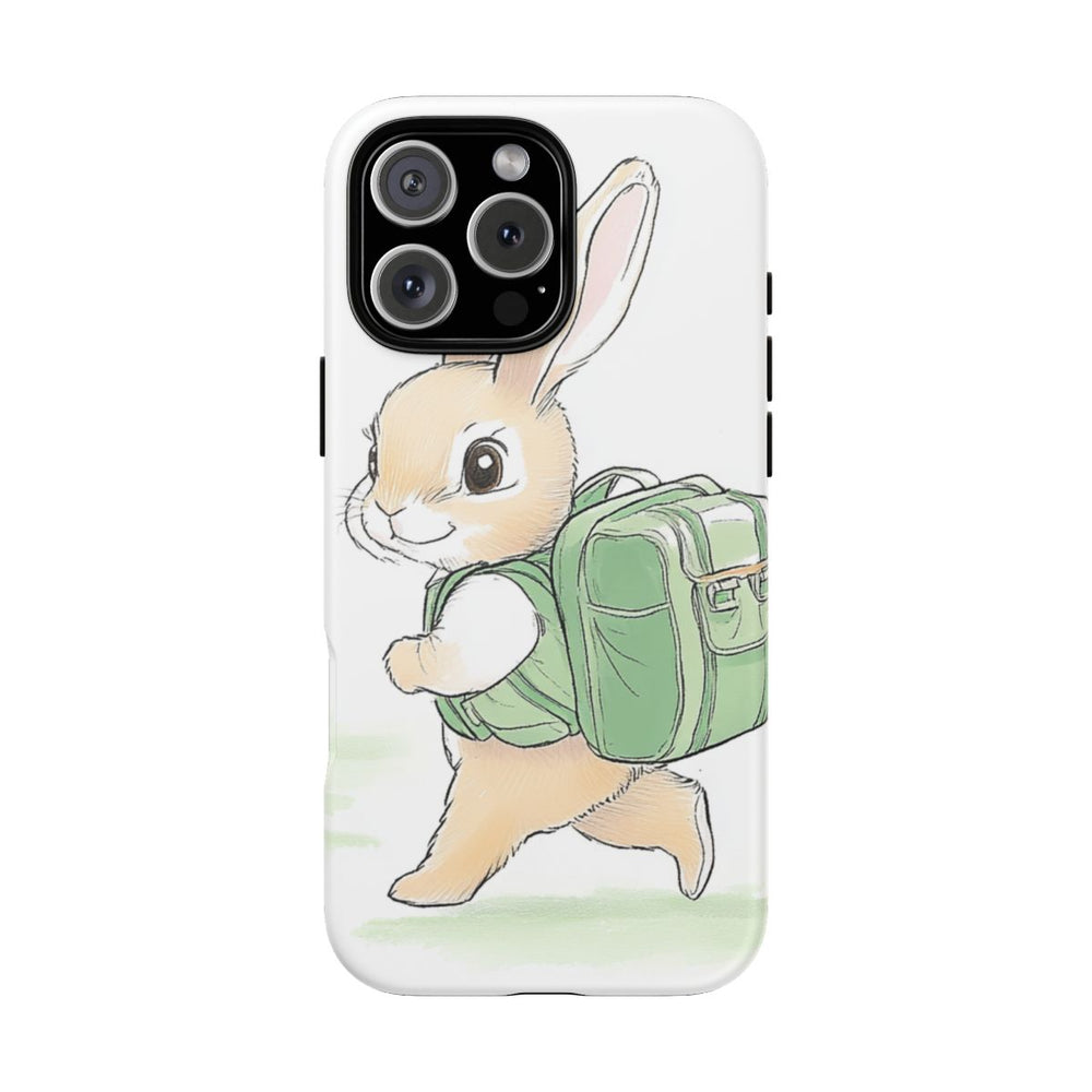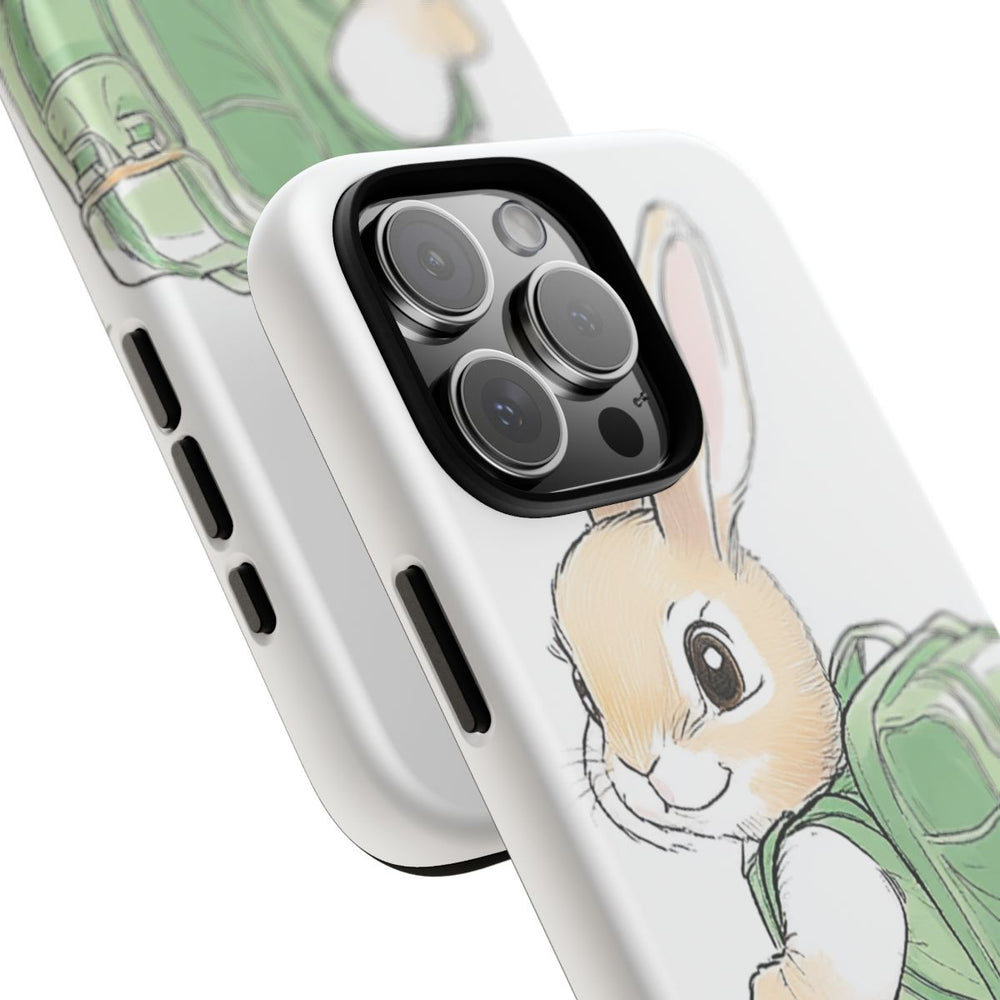 Dit hoesje is voorzien van een lieve illustratie van een konijn dat met een grote groene rugzak wandelt. Het konijn is lichtbruin, heeft grote ogen en lange oren, en staat tegen een zachte achtergrond met subtiele groene bomen en gras. De tekening heeft een vriendelijke, handgetekende uitstraling en is uitgevoerd in pastelkleuren. Het hoesje bestaat uit een dubbele laag met een polycarbonaat buitenkant en een TPU binnenzijde. Het ondersteunt draadloos opladen en is bestand tegen verschillende weersomstandigheden.