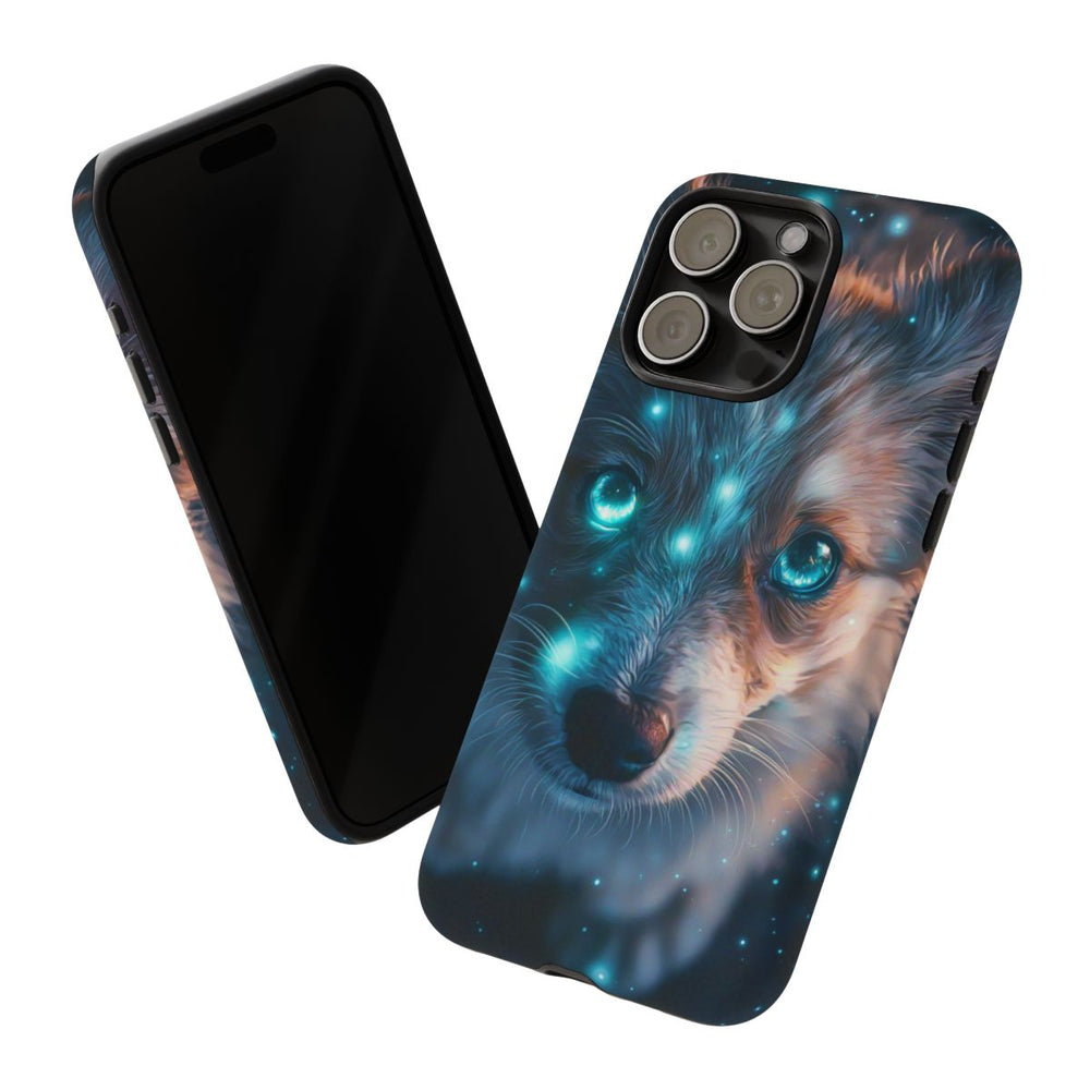 Dit hoesje heeft een ontwerp met een close-up van een schattige puppy met grote, lichtgevende ogen. De vacht van het hondje is versierd met zachte blauw-roze lichtpatronen, wat zorgt voor een magisch effect. Een vriendelijke glimlach en lichtgevende sproetjes geven extra charme aan het geheel, omringd door zwevende lichtdeeltjes. De donkere, dromerige achtergrond versterkt het zachte pastellicht. Het hoesje bestaat uit twee lagen voor extra stevigheid en bescherming en ondersteunt draadloos opladen.