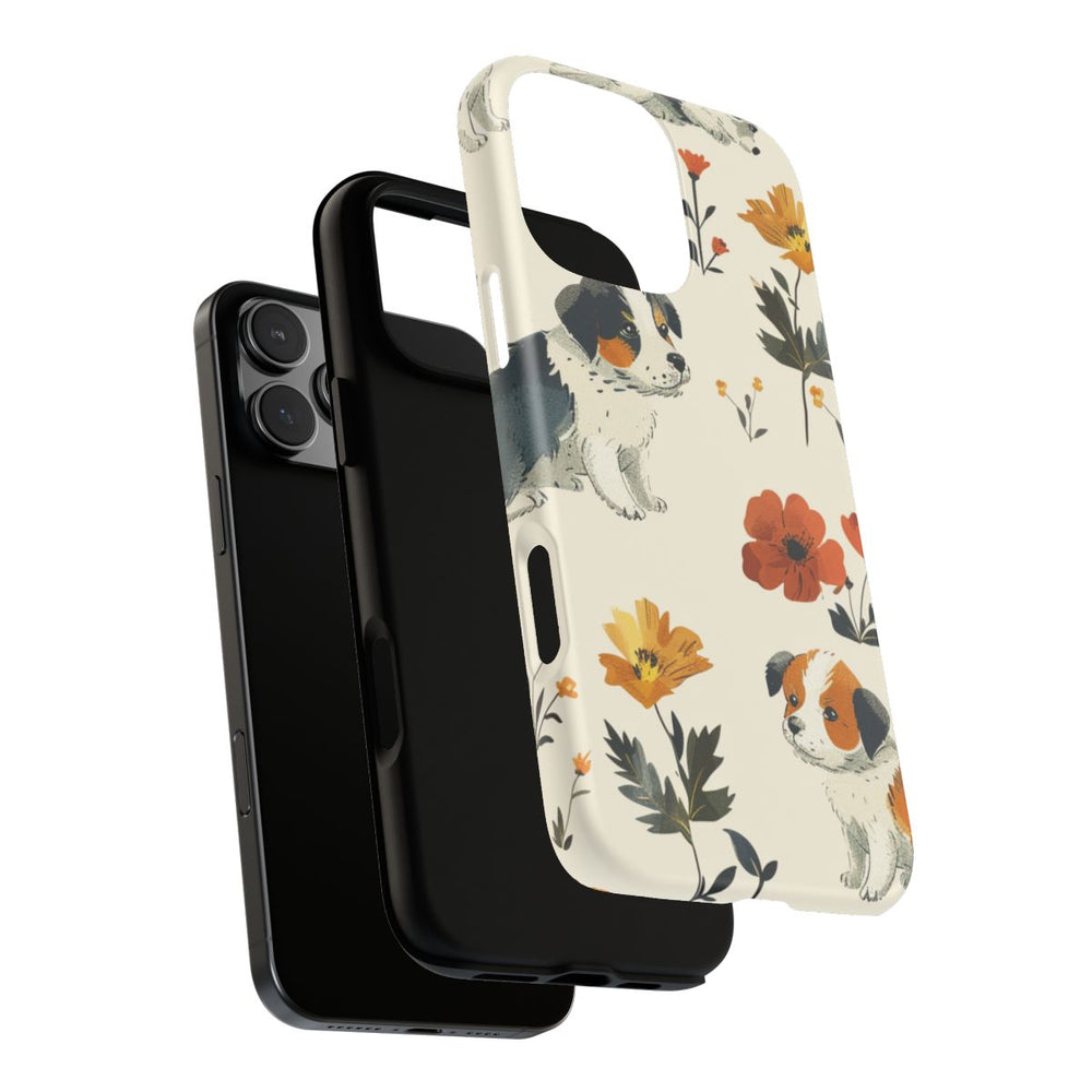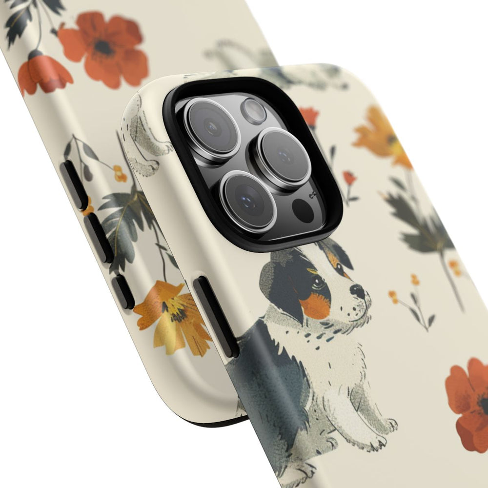 Dit hoesje is voorzien van een herhalend patroon met lieve puppy’s in verschillende houdingen, omringd door gestileerde bloemen. De puppy’s hebben vlekken in zwart, wit en oranje, wat zorgt voor een speelse en charmante uitstraling. De bloemen zijn getekend in warme tinten oranje en geel met groene bladeren, op een zachte beige achtergrond. Het patroon geeft het hoesje een gezellige en vriendelijke uitstraling. Het matte, stevige hoesje biedt dubbele laag bescherming en ondersteunt draadloos opladen.