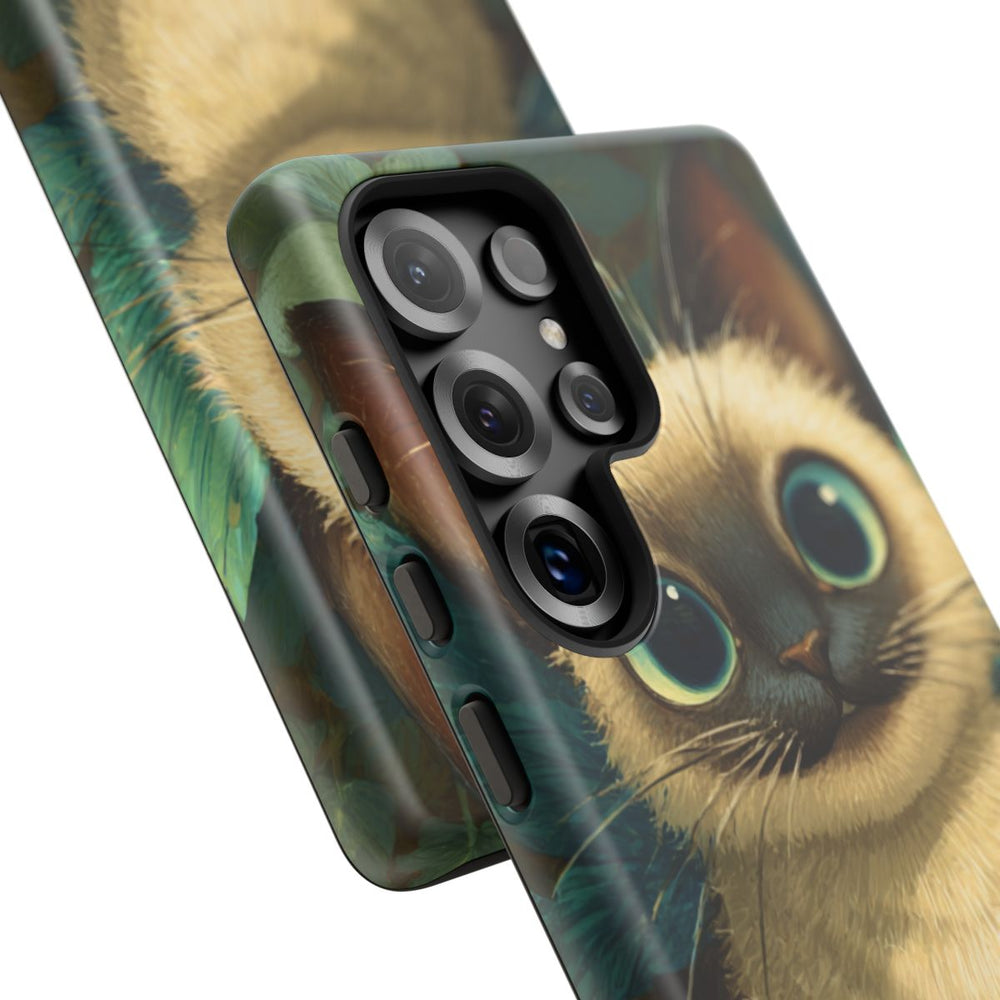 Dit ontwerp toont een lieve Siamees kitten met grote, sprekende blauwe ogen en sprookjesachtige blauwe vleugels. Het katje staat op een ondergrond bedekt met groene bladeren en planten, wat zorgt voor een natuurlijke en dromerige uitstraling. Het telefoonhoesje bestaat uit twee lagen en heeft een matte afwerking. Gemaakt van polycarbonaat en TPU voor extra bescherming en geschikt voor draadloos opladen. De kleuren bestaan vooral uit diverse tinten blauw en groen.