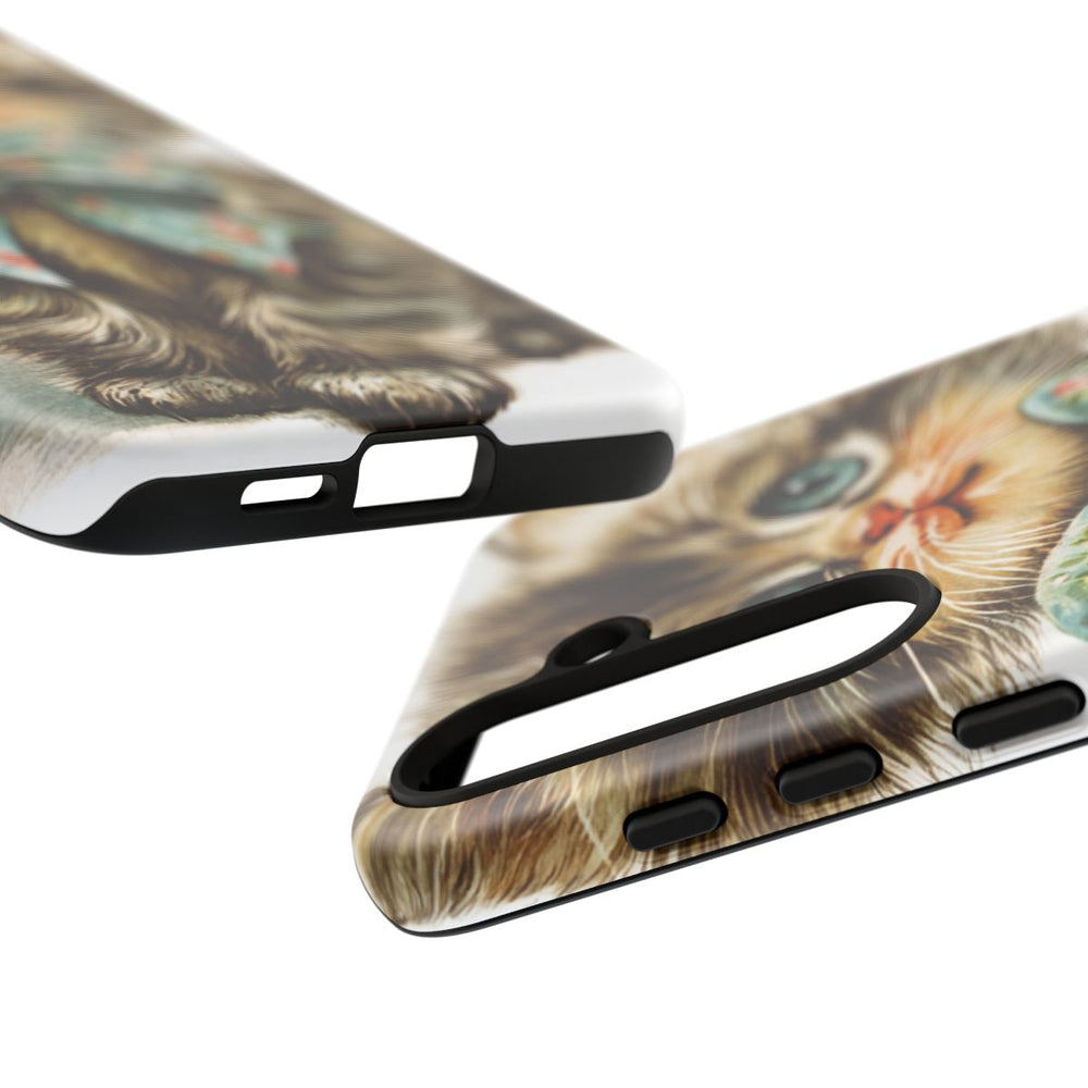 Bescherm je toestel met dit charmante matte hoesje, voorzien van een schattige kitten in vintage stijl met een sierlijke strik. Het ontwerp toont een pluizig katje met heldere, sprekende ogen en geeft je telefoon een vrolijke en stijlvolle uitstraling. Dankzij de dubbele laag van 100% polycarbonaat en TPU biedt dit hoesje optimale bescherming en duurzaamheid. Ideaal voor kattenliefhebbers en fans van retrodetails: dit hoesje combineert functionaliteit met een speelse look.