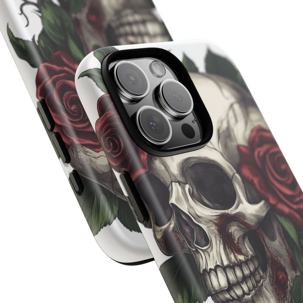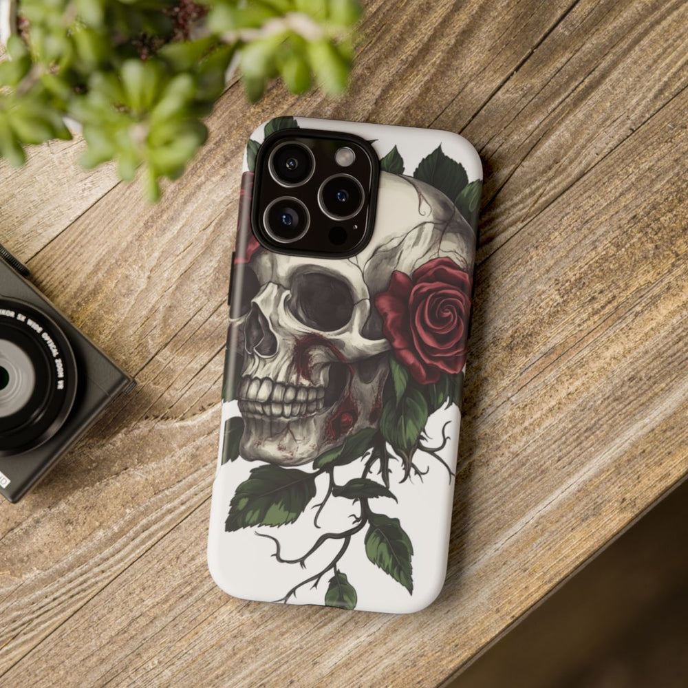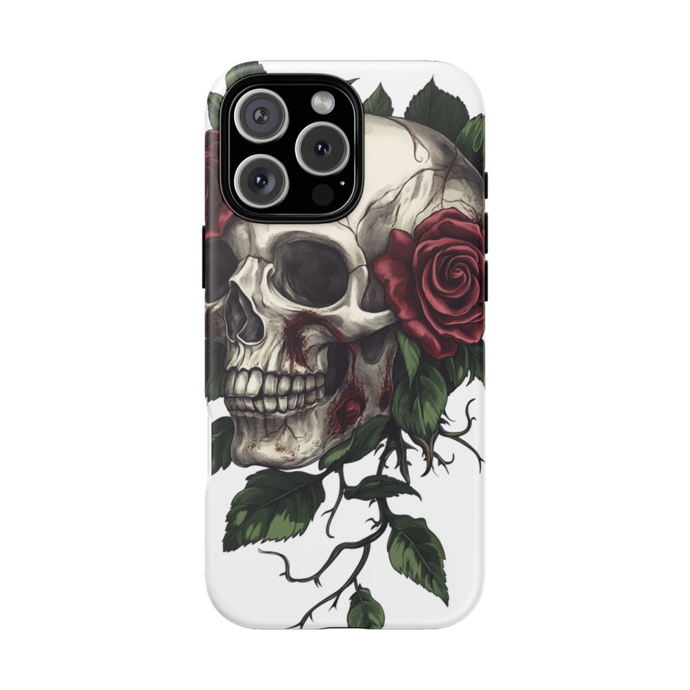 Dit ontwerp toont een gedetailleerde menselijke schedel, omringd door levendige rode rozen en weelderige groene bladeren. De schedel heeft zichtbare barsten en donkere schaduwen, wat zorgt voor diepte en textuur. De afbeelding staat op een stralend witte achtergrond, waardoor het contrast tussen de schedel en de kleurrijke bloemen extra wordt benadrukt. De afbeelding is gedrukt op een mat telefoonhoesje met dubbele laag bescherming en is geschikt voor draadloos opladen.