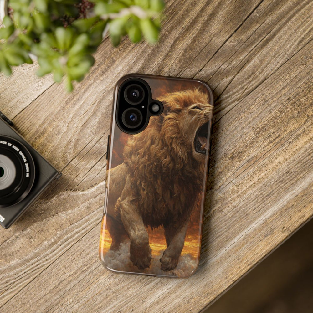 Dit hoesje is voorzien van een gedetailleerde olieverfschildering van een brullende leeuw met een indrukwekkende manen. De leeuw wordt afgebeeld terwijl hij zijn tanden ontbloot en krachtig poseert. Op de achtergrond zijn dramatische, vurige wolken en rook te zien, wat zorgt voor een intense en dynamische uitstraling. Het glanzende, stevige hoesje heeft een dubbele laag: een buitenkant van polycarbonaat en een binnenvoering van TPU voor extra bescherming. Dit hoesje ondersteunt draadloos opladen en is bestand tegen invloeden van buitenaf.
