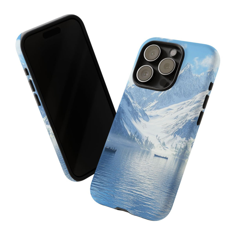 Deze afbeelding toont een helderblauw meer, omringd door hoge, besneeuwde bergen onder een heldere lucht met verspreide wolken. Op het rustige water drijven meerdere kleine houten roeiboten, elk met twee personen aan boord. Langs de oever groeien groene grasvelden en bomen. Dit matte, stevige telefoonhoesje heeft een dubbele laag van polycarbonaat en TPU voor extra bescherming en is geschikt voor draadloos opladen.