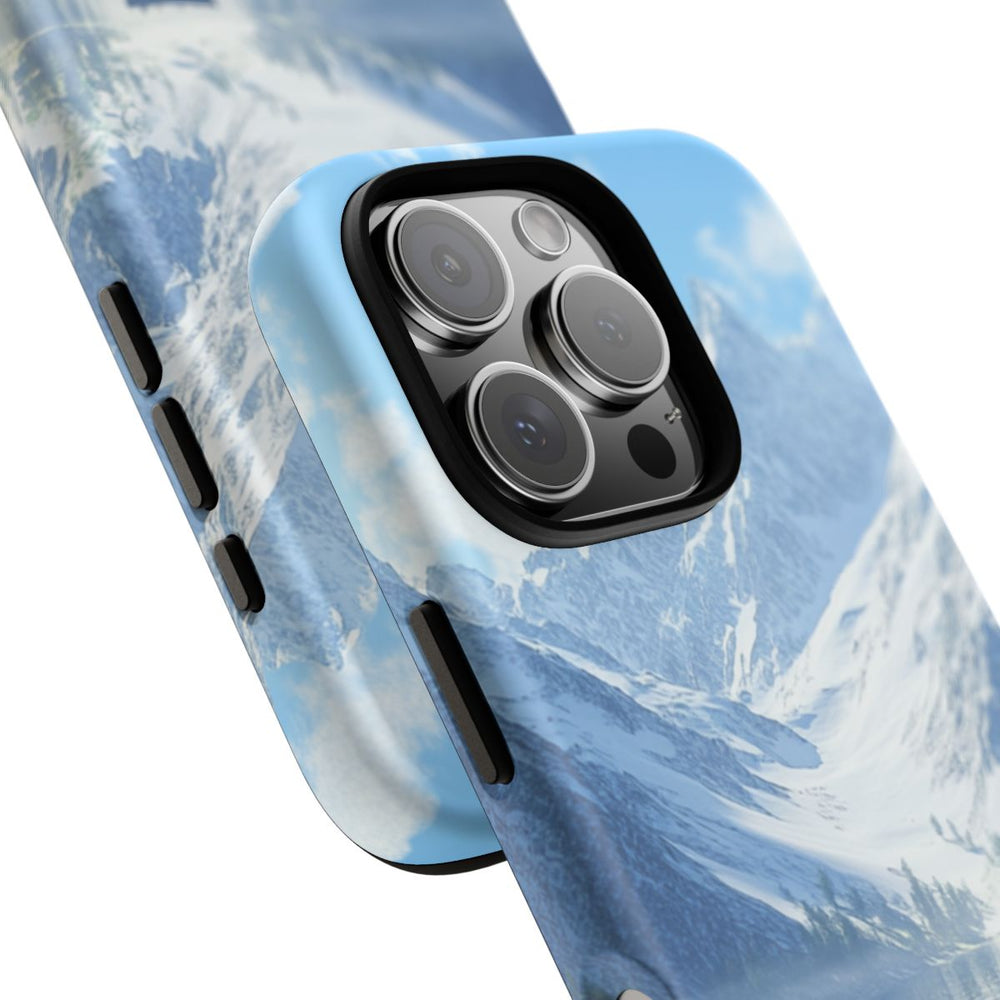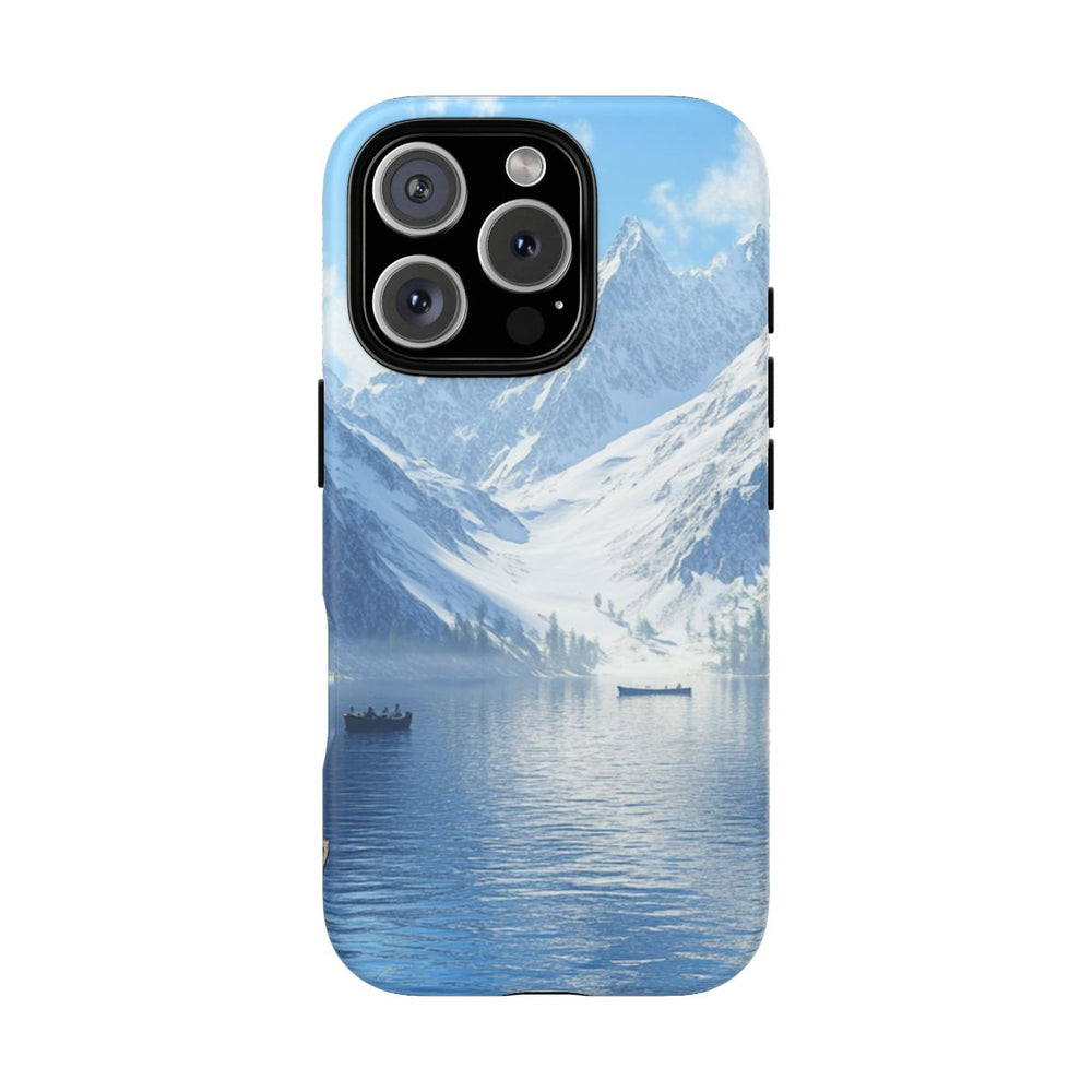 Dit hoesje toont een rustig blauw meer, omringd door hoge bergen met besneeuwde toppen onder een deels bewolkte hemel. Op het kalme water drijven meerdere kleine houten roeiboten, elk met twee personen aan boord. Langs de waterkant zijn groene begroeiing en open plekken zichtbaar. De heldere daglicht zorgt voor een vredige en natuurlijke uitstraling. Het stevige telefoonhoesje heeft een dubbele laag met een matte afwerking, een polycarbonaat buitenkant en een TPU-binnenzijde. Geschikt voor draadloos opladen.