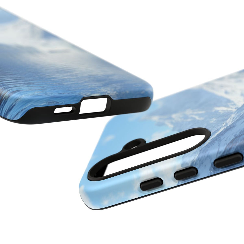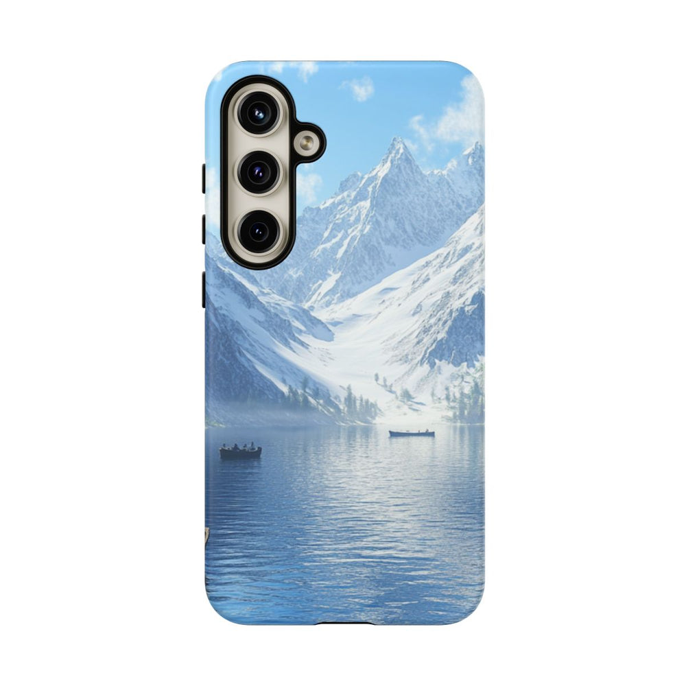 Dit telefoonhoesje toont een rustig meer, omringd door hoge bergen met besneeuwde toppen onder een heldere blauwe lucht met enkele wolken. Op het kalme, blauwe water drijven meerdere kleine houten roeiboten, elk met twee personen aan boord. De oever is begroeid met groen gras en bomen, en het geheel wordt verlicht door de middagzon. Het hoesje heeft een dubbele laag met een matte afwerking, een stevige polycarbonaat buitenkant en een TPU binnenlaag. Het is ontworpen voor optimale bescherming en geschikt voor draadloos opladen.