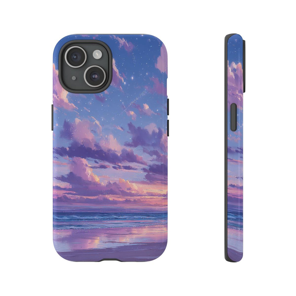 Dit ontwerp toont een rustige oceaanscène onder een levendige paarse en roze avondlucht. Zachte wolken verspreiden zich over de hemel en weerspiegelen prachtig op het kalme water eronder. Het beeld vangt een vredig moment met zachte golven en een verre horizon en zorgt zo voor een dromerige, serene sfeer. Het hoesje is stevig opgebouwd uit twee lagen: een harde polycarbonaat buitenkant en een TPU-binnenzijde. Zo biedt het optimale bescherming en is het geschikt voor draadloos opladen.