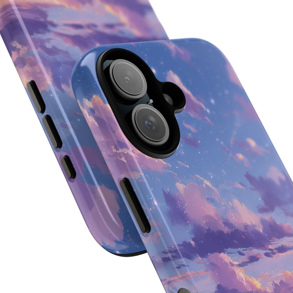 Dit ontwerp toont een rustige oceaanscène onder een levendige paarse en roze avondlucht. Zachte wolken verspreiden zich over de hemel en weerspiegelen prachtig op het kalme water eronder. Het beeld vangt een vredig moment met zachte golven en een verre horizon en zorgt zo voor een dromerige, serene sfeer. Het hoesje is stevig opgebouwd uit twee lagen: een harde polycarbonaat buitenkant en een TPU-binnenzijde. Zo biedt het optimale bescherming en is het geschikt voor draadloos opladen.