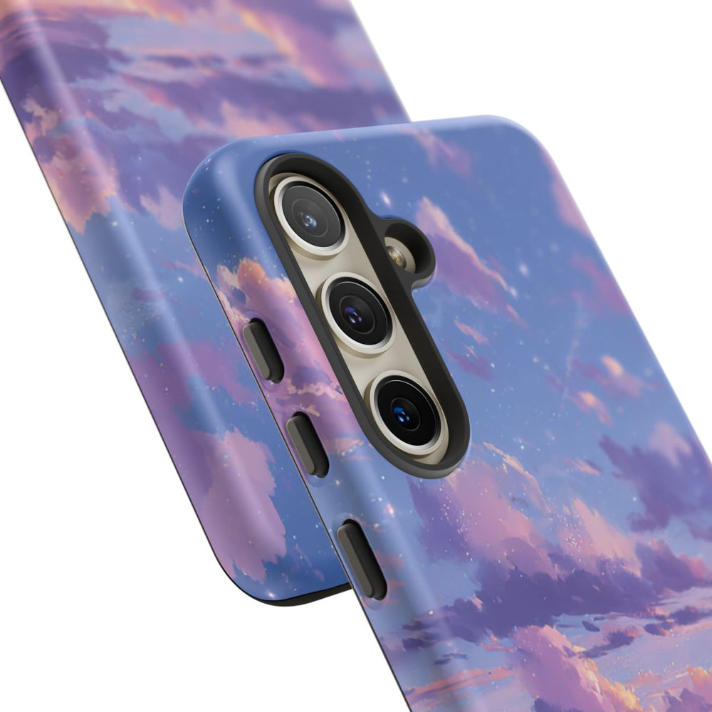 Dit hoesje toont een rustgevend strandlandschap bij zonsondergang, met een paarse en roze lucht vol zachte wolken. De kalme zee weerspiegelt de kleuren van de lucht en zorgt voor een vredige en serene sfeer. Op de voorgrond is het zandstrand zichtbaar, wat bijdraagt aan de natuurlijke uitstraling van het geheel. De afbeelding is gedrukt op een mat hoesje met een stevige polycarbonaat buitenkant en een TPU binnenzijde. Dit hoesje biedt extra stevigheid en bescherming, en is geschikt voor draadloos opladen.