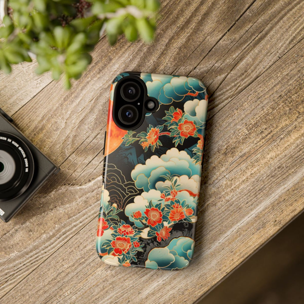 Dit hoesje heeft een opvallende oranje maan tegen een donkere achtergrond. Rondom de maan zweven sierlijke wolken in blauw- en wittinten, afgewerkt met verfijnde gouden lijnen. Een bloeiende tak met oranje bloemen en groene bladeren loopt door het ontwerp en geeft het geheel een natuurlijke en artistieke uitstraling. De afbeelding is gedrukt op een glanzend, stevig hoesje van polycarbonaat en TPU, dat bestaat uit twee beschermende lagen en geschikt is voor draadloos opladen.