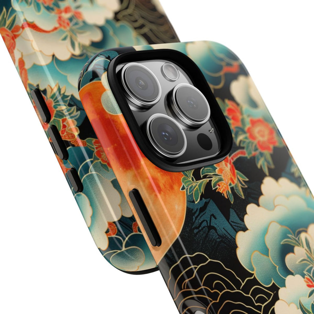 Dit hoesje heeft een opvallende oranje maan tegen een donkere achtergrond. Rondom de maan zweven sierlijke wolken in blauw- en wittinten, afgewerkt met verfijnde gouden lijnen. Een bloeiende tak met oranje bloemen en groene bladeren loopt door het ontwerp en geeft het geheel een natuurlijke en artistieke uitstraling. De afbeelding is gedrukt op een glanzend, stevig hoesje van polycarbonaat en TPU, dat bestaat uit twee beschermende lagen en geschikt is voor draadloos opladen.