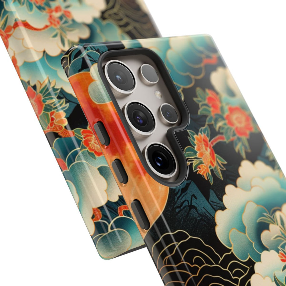 Dit hoesje heeft een opvallende oranje maan tegen een donkere achtergrond. Rondom de maan zweven sierlijke wolken in blauw- en wittinten, afgewerkt met verfijnde gouden lijnen. Een bloeiende tak met oranje bloemen en groene bladeren loopt door het ontwerp en geeft het geheel een natuurlijke en artistieke uitstraling. De afbeelding is gedrukt op een glanzend, stevig hoesje van polycarbonaat en TPU, dat bestaat uit twee beschermende lagen en geschikt is voor draadloos opladen.