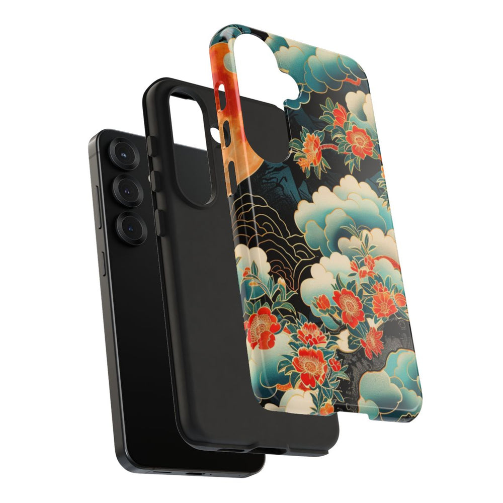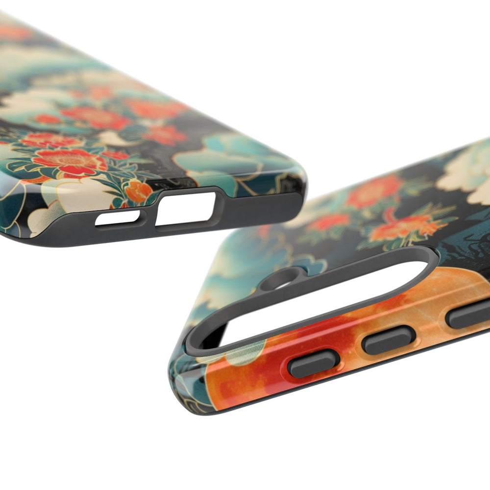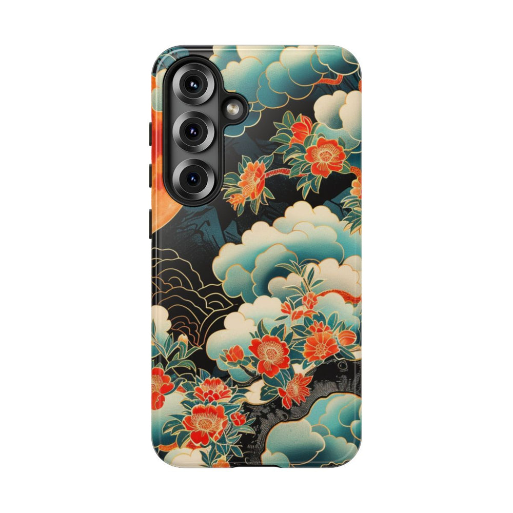 Dit hoesje heeft een opvallende oranje maan tegen een donkere achtergrond. Rondom de maan zweven sierlijke wolken in blauw- en wittinten, afgewerkt met verfijnde gouden lijnen. Een bloeiende tak met oranje bloemen en groene bladeren loopt door het ontwerp en geeft het geheel een natuurlijke en artistieke uitstraling. De afbeelding is gedrukt op een glanzend, stevig hoesje van polycarbonaat en TPU, dat bestaat uit twee beschermende lagen en geschikt is voor draadloos opladen.