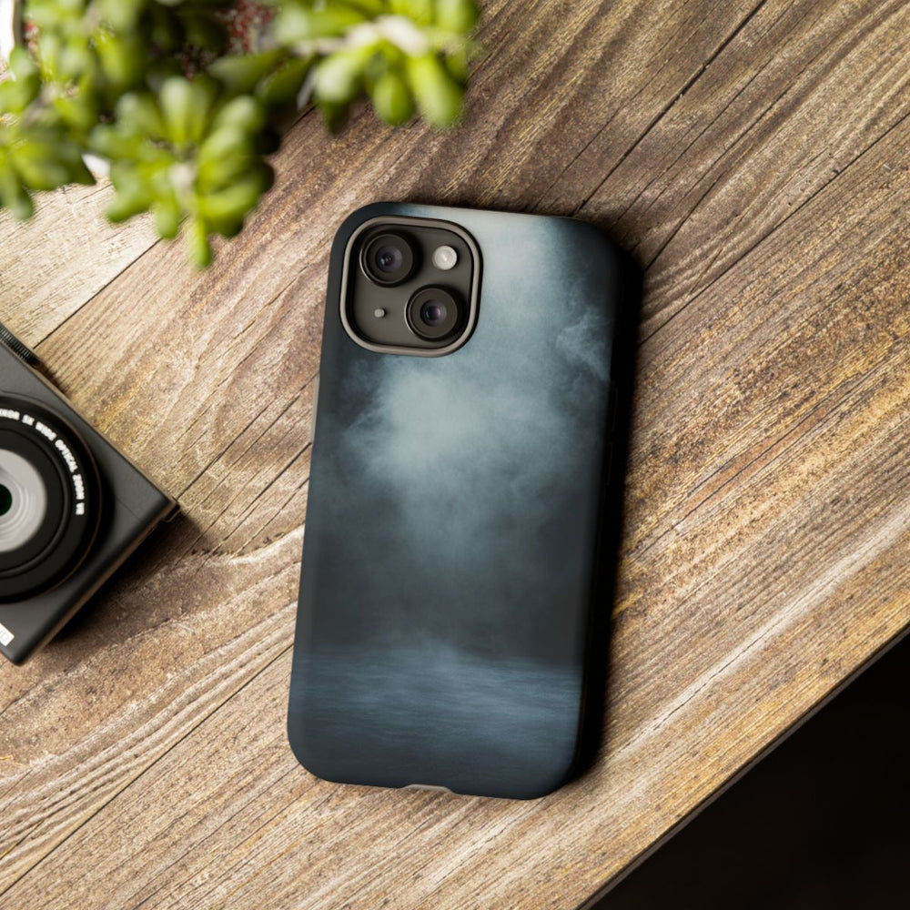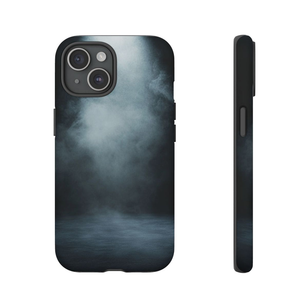 Dit hoesje heeft een diepzwarte achtergrond met een helder, zacht licht dat van bovenaf naar beneden schijnt. Een subtiel mist- of rookeffect zorgt voor een mysterieuze en intrigerende uitstraling. Onderaan is een licht verlichte, getextureerde ondergrond zichtbaar. Het hoesje bestaat uit twee lagen: een stevige buitenkant van polycarbonaat en een TPU-binnenkant voor extra bescherming. Ondersteunt draadloos opladen.