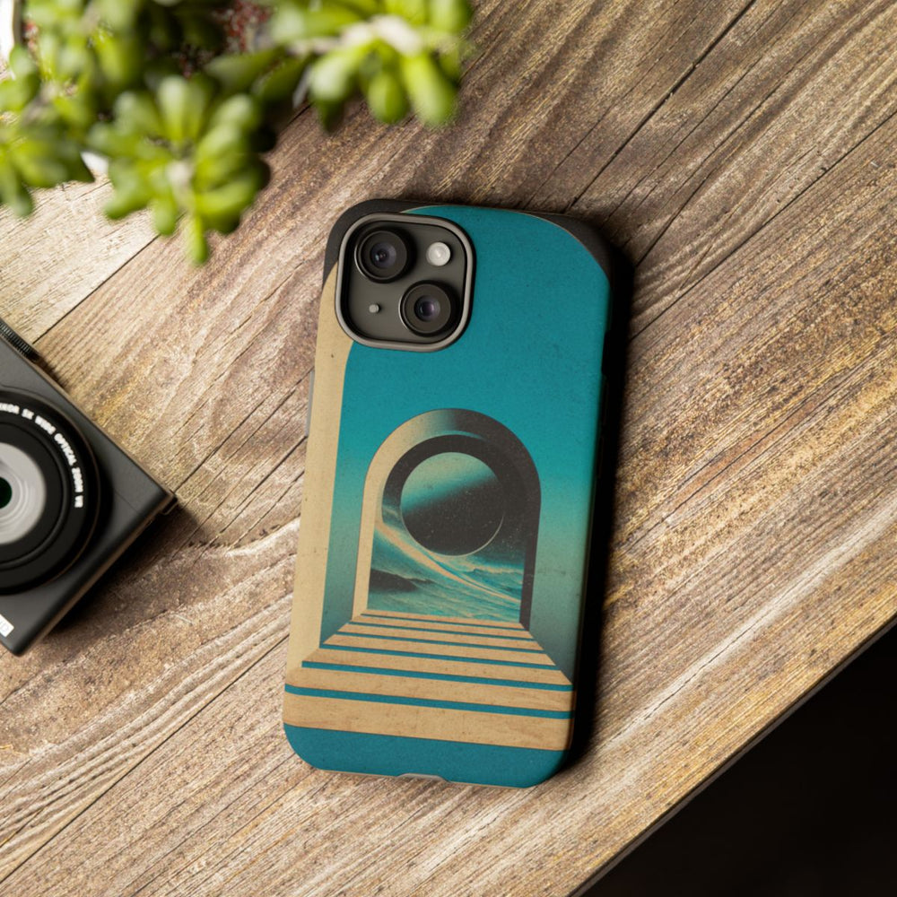 Dit hoesje toont een surrealistisch tafereel met een reeks beige poorten die samen een tunnel vormen, leidend naar een donkere bol die zweeft in de verte. De bogen en treden zijn geplaatst tegen een achtergrond met een kleurverloop van diepzwart bovenaan naar helderblauw onderaan. Het ontwerp heeft een vintage, getextureerde uitstraling met minimalistische geometrische vormen en een mysterieuze, buitenaardse sfeer. Het hoesje bestaat uit twee lagen: een matte polycarbonaat buitenkant en een TPU binnenzijde. Geschikt voor draadloos opladen.