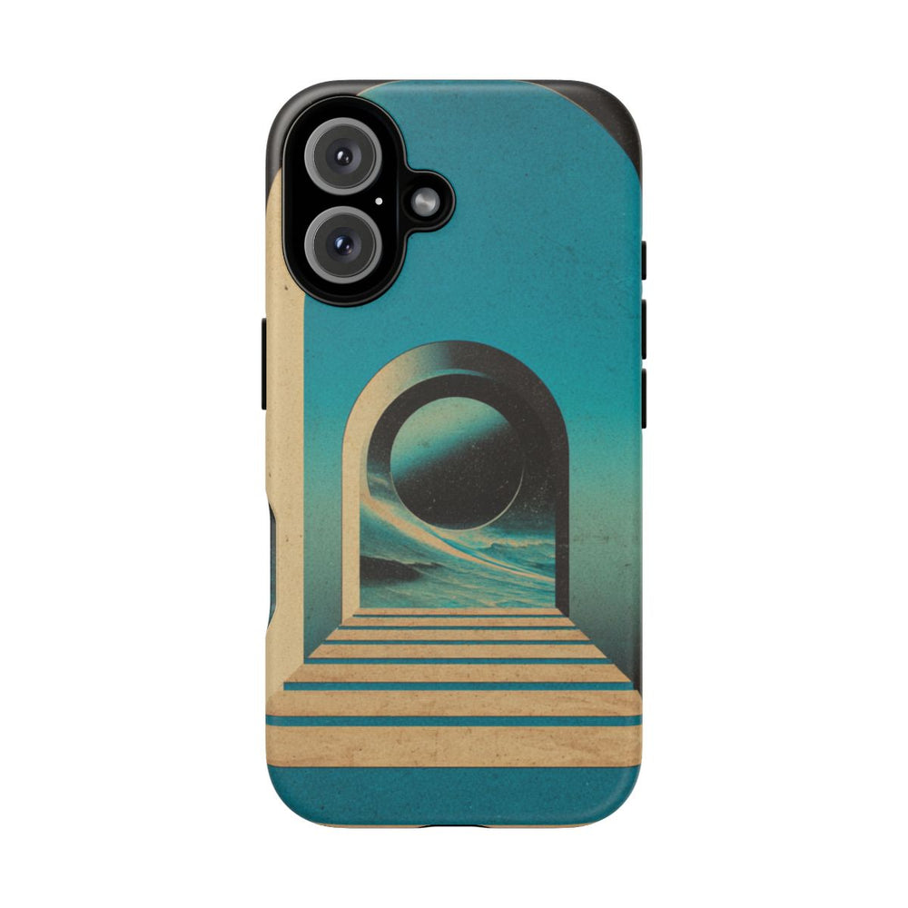 Dit hoesje toont een surrealistisch tafereel met een reeks beige poorten die samen een tunnel vormen, leidend naar een donkere bol die zweeft in de verte. De bogen en treden zijn geplaatst tegen een achtergrond met een kleurverloop van diepzwart bovenaan naar helderblauw onderaan. Het ontwerp heeft een vintage, getextureerde uitstraling met minimalistische geometrische vormen en een mysterieuze, buitenaardse sfeer. Het hoesje bestaat uit twee lagen: een matte polycarbonaat buitenkant en een TPU binnenzijde. Geschikt voor draadloos opladen.