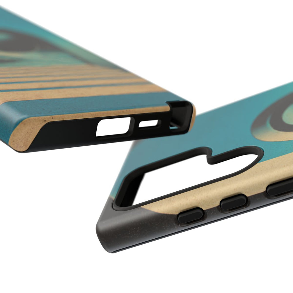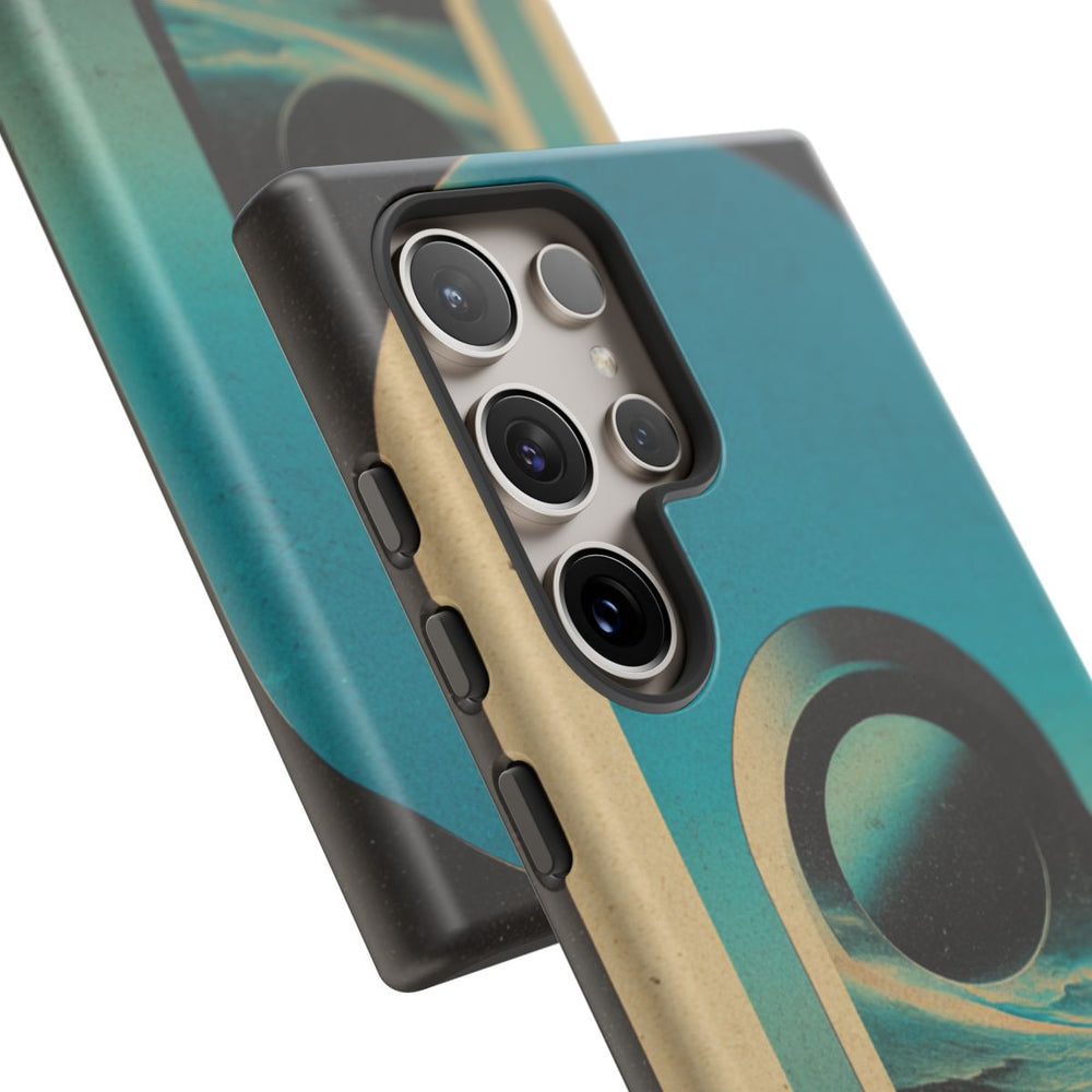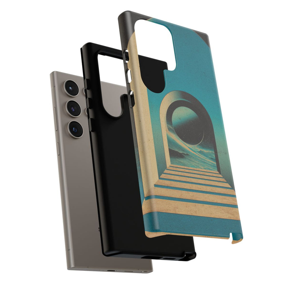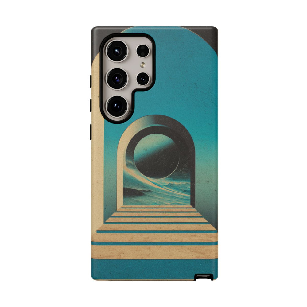 Dit hoesje toont een surrealistisch tafereel met een reeks beige poorten die samen een tunnel vormen, leidend naar een donkere bol die zweeft in de verte. De bogen en treden zijn geplaatst tegen een achtergrond met een kleurverloop van diepzwart bovenaan naar helderblauw onderaan. Het ontwerp heeft een vintage, getextureerde uitstraling met minimalistische geometrische vormen en een mysterieuze, buitenaardse sfeer. Het hoesje bestaat uit twee lagen: een matte polycarbonaat buitenkant en een TPU binnenzijde. Geschikt voor draadloos opladen.