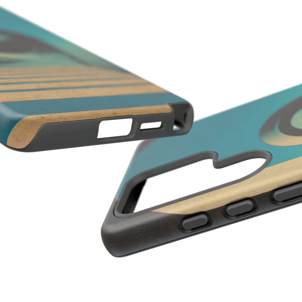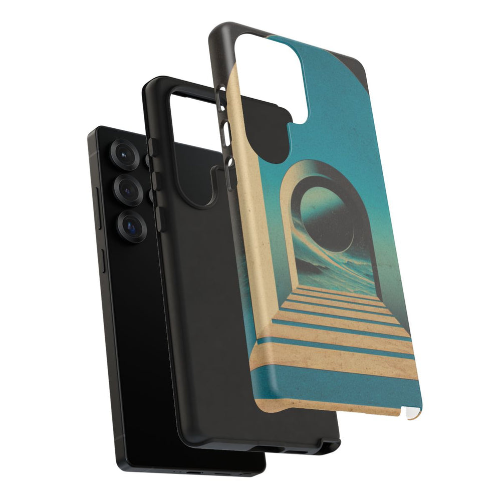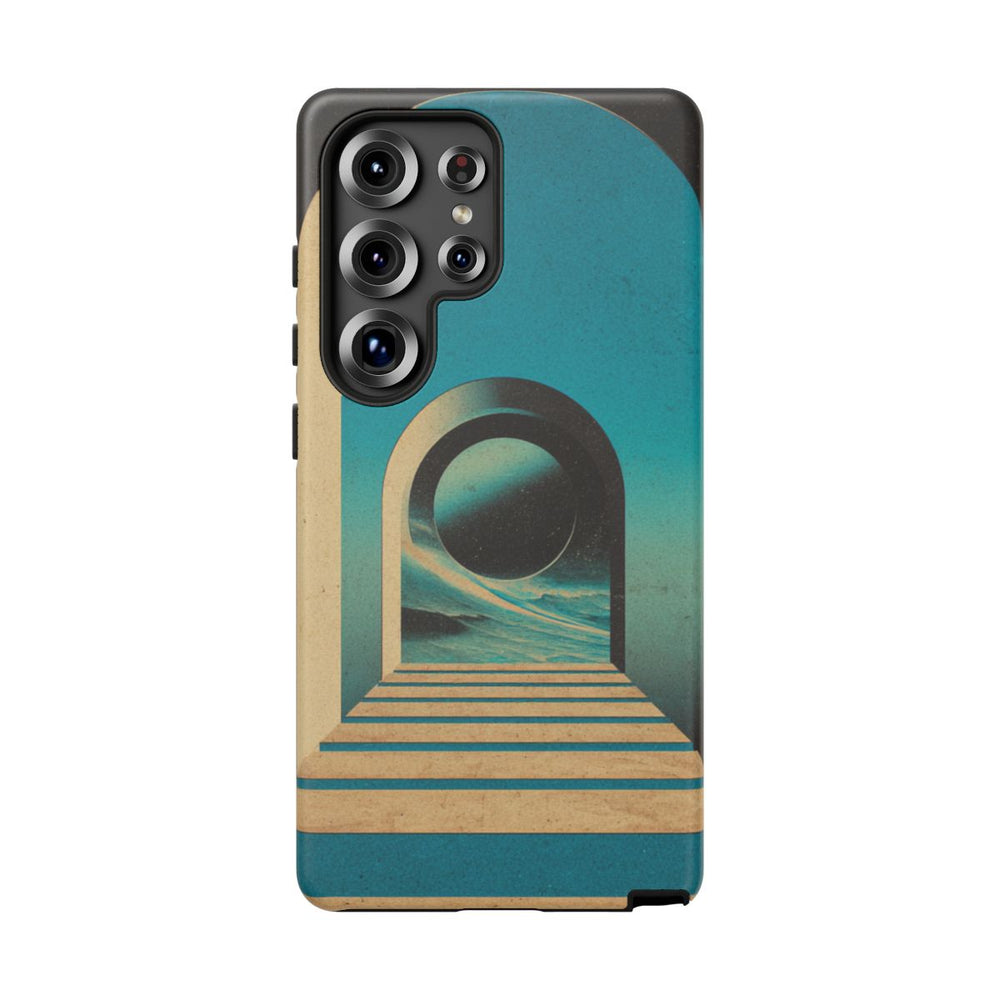 Dit hoesje toont een surrealistisch tafereel met een reeks beige poorten die samen een tunnel vormen, leidend naar een donkere bol die zweeft in de verte. De bogen en treden zijn geplaatst tegen een achtergrond met een kleurverloop van diepzwart bovenaan naar helderblauw onderaan. Het ontwerp heeft een vintage, getextureerde uitstraling met minimalistische geometrische vormen en een mysterieuze, buitenaardse sfeer. Het hoesje bestaat uit twee lagen: een matte polycarbonaat buitenkant en een TPU binnenzijde. Geschikt voor draadloos opladen.