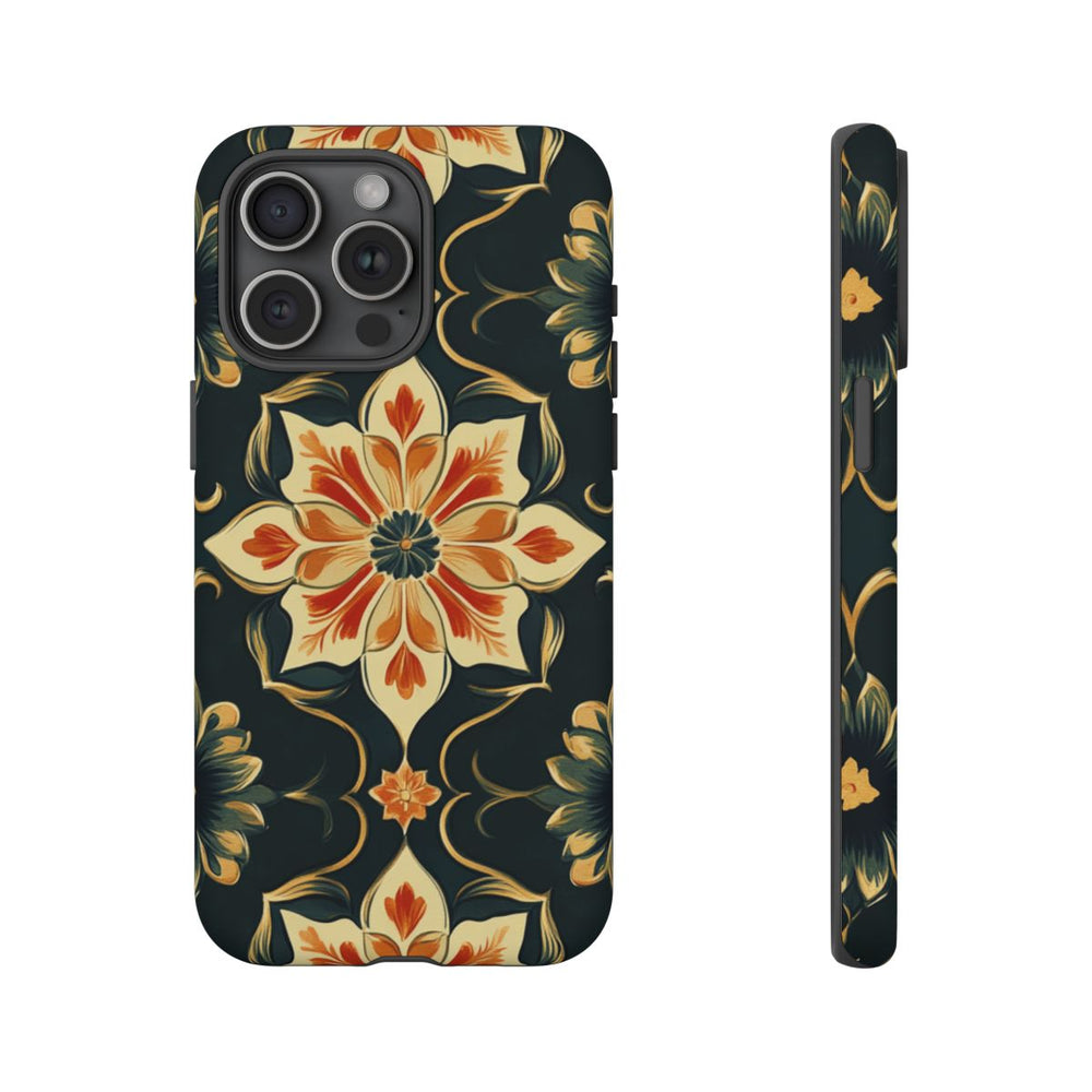 Dit hoesje is voorzien van een naadloos bloemenpatroon met grote, gestileerde bloemen in crème, oranje en donkerblauw. De bloemen hebben verfijnde bloemblaadjes en zijn symmetrisch geplaatst op een diepzwarte achtergrond. Tussen de bloemen lopen sierlijke ranken in beige en goudtinten, wat zorgt voor een elegante en klassieke uitstraling. Het ontwerp is gedrukt op een matte, extra stevige hoes met dubbele laag van polycarbonaat en TPU. Dit biedt uitstekende bescherming en maakt draadloos opladen mogelijk.