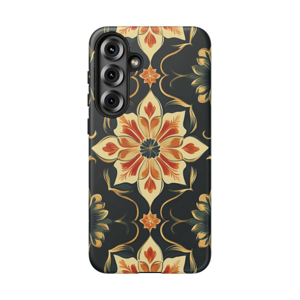 Dit hoesje is voorzien van een naadloos bloemenpatroon met grote, gestileerde bloemen in crème, oranje en donkerblauw. De bloemen hebben verfijnde bloemblaadjes en zijn symmetrisch geplaatst op een diepzwarte achtergrond. Tussen de bloemen lopen sierlijke ranken in beige en goudtinten, wat zorgt voor een elegante en klassieke uitstraling. Het ontwerp is gedrukt op een matte, extra stevige hoes met dubbele laag van polycarbonaat en TPU. Dit biedt uitstekende bescherming en maakt draadloos opladen mogelijk.