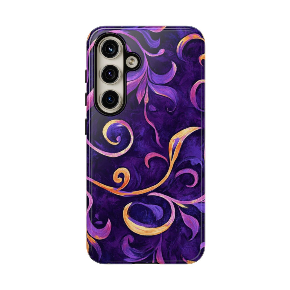 Dit telefoonhoesje heeft een verfijnd patroon van sierlijke filigraan en fleur-de-lis motieven in paarse en gouden tinten. De achtergrond is diep en rijk paars met subtiele penseelstreken voor een levendig en dynamisch effect. Gouden accenten benadrukken de elegante vormen en geven het ontwerp een luxe en artistieke uitstraling. Het glanzende, stevige hoesje is gemaakt van duurzaam polycarbonaat met een TPU-voering voor extra bescherming en ondersteunt draadloos opladen.