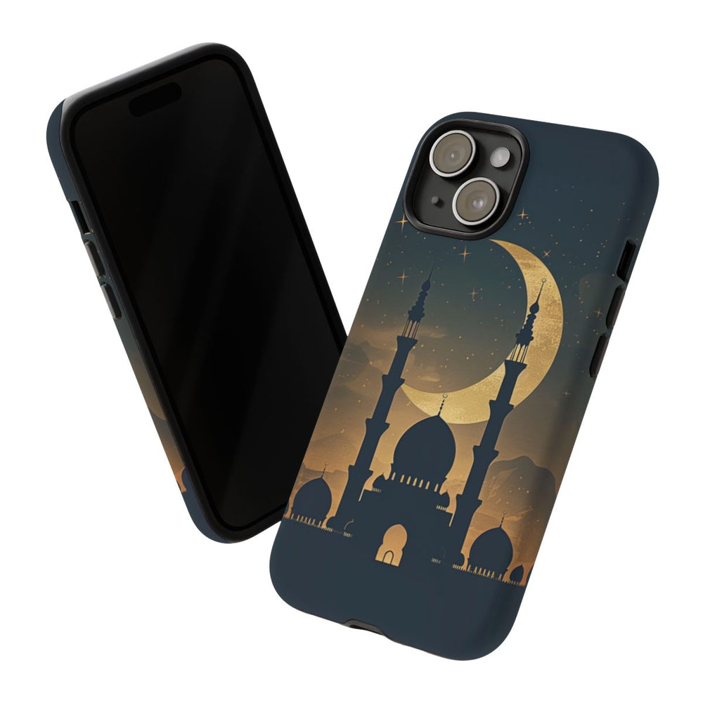 Dit hoesje is voorzien van een prachtige silhouet van een moskee tegen een donkere achtergrond, verlicht door een sikkelmaan en fonkelende sterren. De diepe blauwtinten en warme goudkleuren zorgen voor een elegante en serene uitstraling. Het minimalistische, maar opvallende ontwerp is ideaal voor liefhebbers van moderne islamitische kunst. Het stevige materiaal biedt optimale bescherming voor je toestel en laat tegelijkertijd dit schitterende design goed tot zijn recht komen.