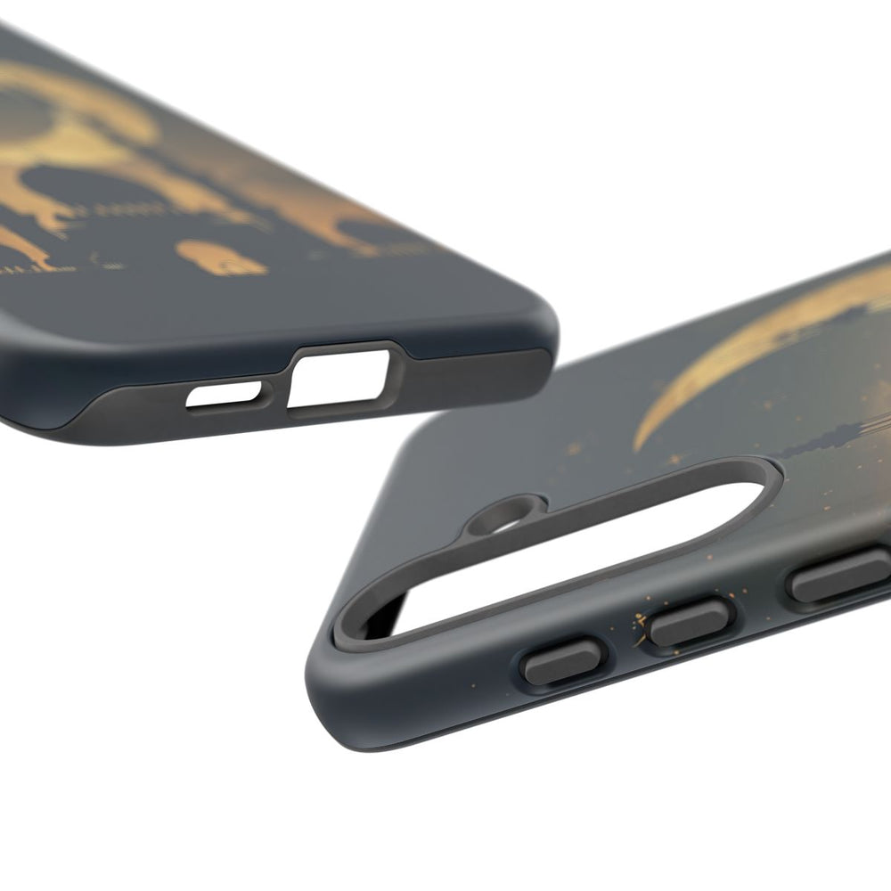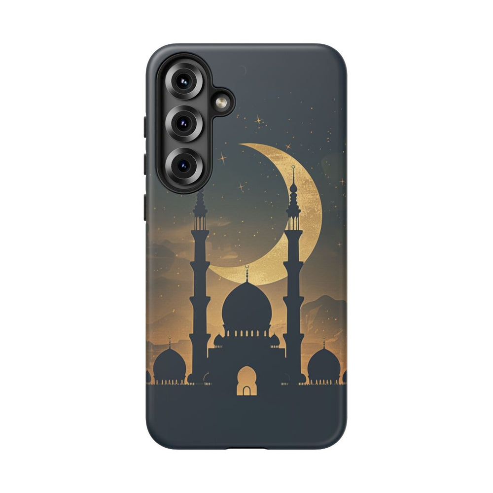 Dit telefoonhoesje is voorzien van een prachtig ontwerp met een silhouet van een moskee tegen een donkere achtergrond. Een grote sikkelmaan en fonkelende sterren geven het geheel een magische uitstraling. De kleuren bestaan uit diepe blauwtinten en zacht goud, wat zorgt voor een elegante en serene sfeer. Het hoesje is gemaakt van stevige materialen en biedt optimale bescherming voor je toestel, terwijl het deze mooie illustratie laat zien.