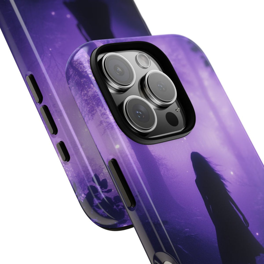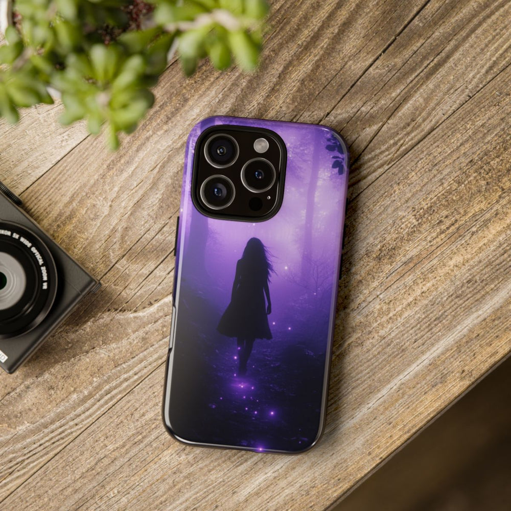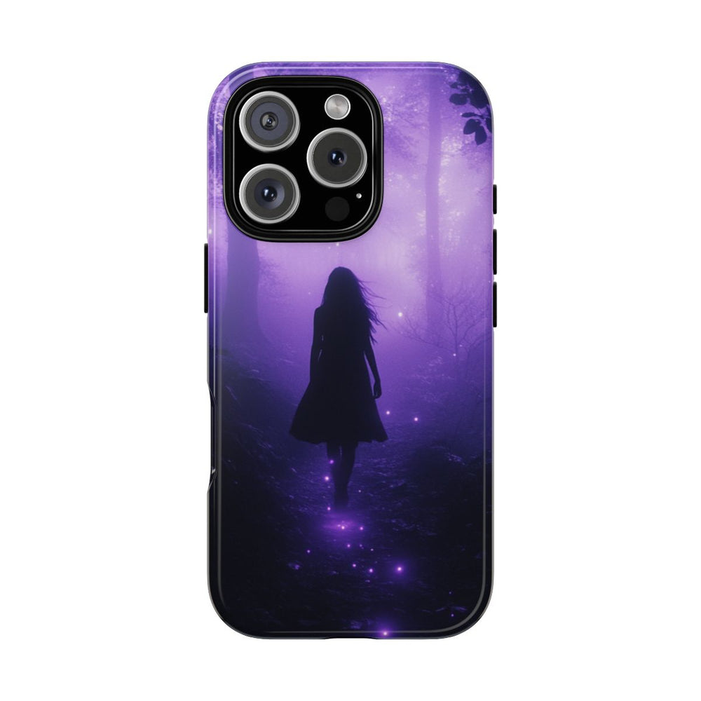 Dit telefoonhoesje toont een donker bos dat wordt verlicht door een krachtige paarse gloed. Op de afbeelding loopt de silhouet van een vrouw in een jurk over een pad, omringd door hoge bomen. Kleine lichtgevende bolletjes en een oplichtende vlinder zorgen voor een magisch effect. De mistige achtergrond versterkt de mysterieuze en dromerige sfeer. Het ontwerp is bedrukt op een glanzend, stevig hoesje van polycarbonaat en TPU, dat bestaat uit twee beschermende lagen en geschikt is voor draadloos opladen.