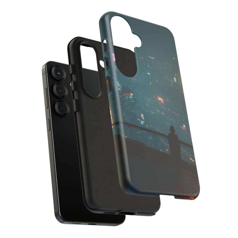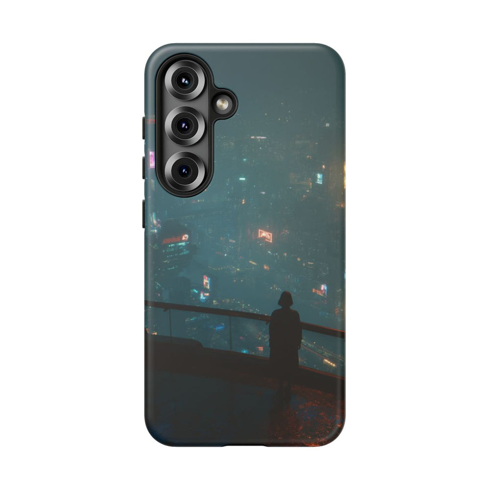 Dit ontwerp toont een eenzame figuur die op een hoog terras staat en uitkijkt over een uitgestrekte stad bij nacht. Beneden schitteren talloze verlichte gebouwen en felgekleurde neonreclames. Het terras heeft een glazen balustrade en de vloer weerspiegelt de kleurrijke lichten van de stad. De mistige sfeer zorgt voor een zachte gloed rondom de verlichting. Deze afbeelding is gedrukt op een mat, extra stevig hoesje met een dubbele laag voor optimale bescherming en ondersteuning van draadloos opladen.