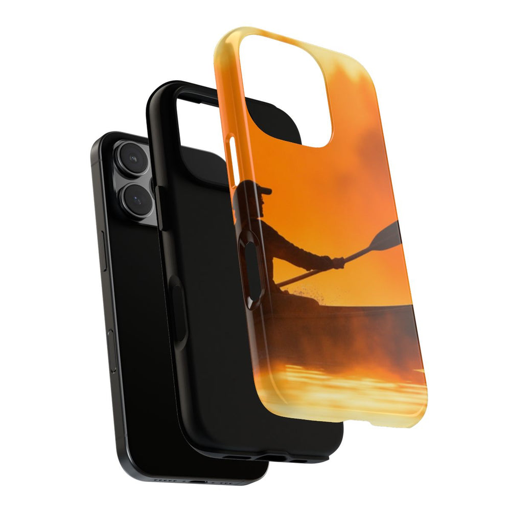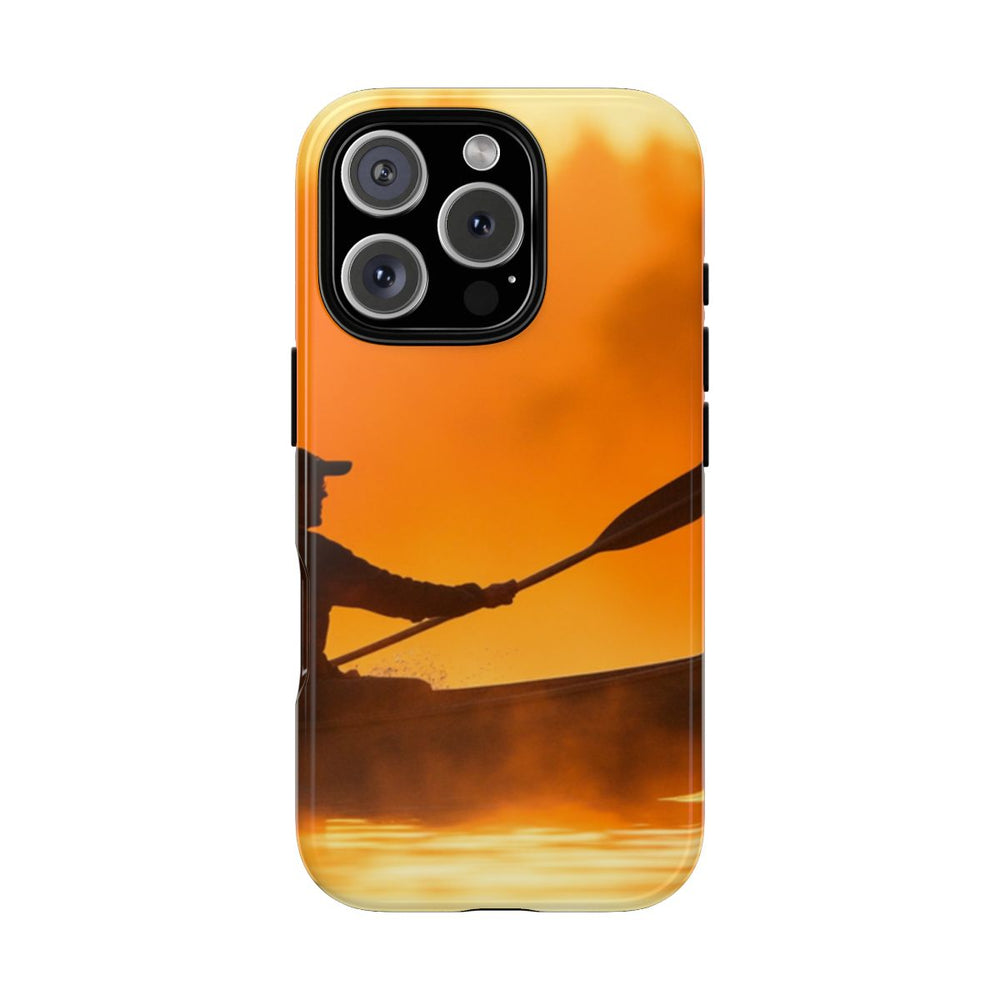 Deze afbeelding toont het silhouet van een persoon die in een kano peddelt op rustig water tijdens de zonsondergang. De warme oranje en gouden tinten zorgen voor een vredige en serene sfeer. Op de achtergrond zijn vage bomen en nevel boven het water te zien, wat het rustige gevoel versterkt. Dit glanzende, stevige hoesje is gemaakt van een polycarbonaat buitenkant met een TPU-binnenzijde en biedt uitstekende bescherming en duurzaamheid, ideaal voor buitengebruik. Ondersteunt draadloos opladen.